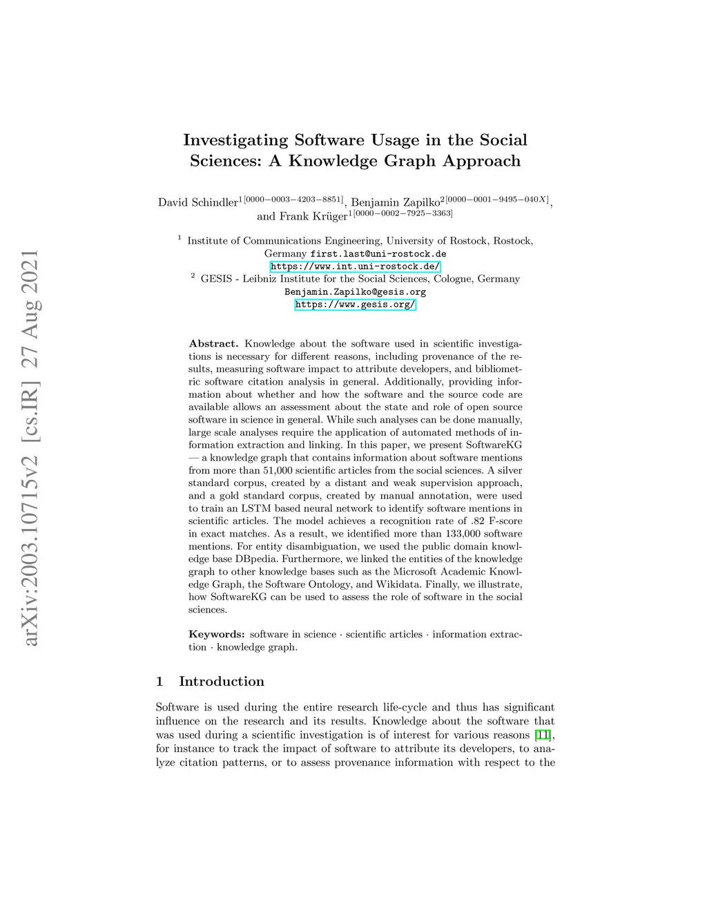 Knowledge about the software used in scientific investigations is necessary for different reasons, including provenance of the results, measuring software impact to attribute developers, and bibliometric software citation analysis in general. Additionally, providing information about whether and how the software and the source code are available allows an assessment about the state and role of open source software in science in general. While such analyses can be done manually, large scale analyses require the application of automated methods of information extraction and linking. In this paper, we present SoftwareKG - a knowledge graph that contains information about software mentions from more than 51,000 scientific articles from the social sciences. A silver standard corpus, created by a distant and weak supervision approach, and a gold standard corpus, created by manual annotation, were used to train an LSTM based neural network to identify software mentions in scientific articles. The model achieves a recognition rate of .82 F-score in exact matches. As a result, we identified more than 133,000 software mentions. For entity disambiguation, we used the public domain knowledge base DBpedia. Furthermore, we linked the entities of the knowledge graph to other knowledge bases such as the Microsoft Academic Knowledge Graph, the Software Ontology, and Wikidata. Finally, we illustrate, how SoftwareKG can be used to assess the role of software in the social sciences.