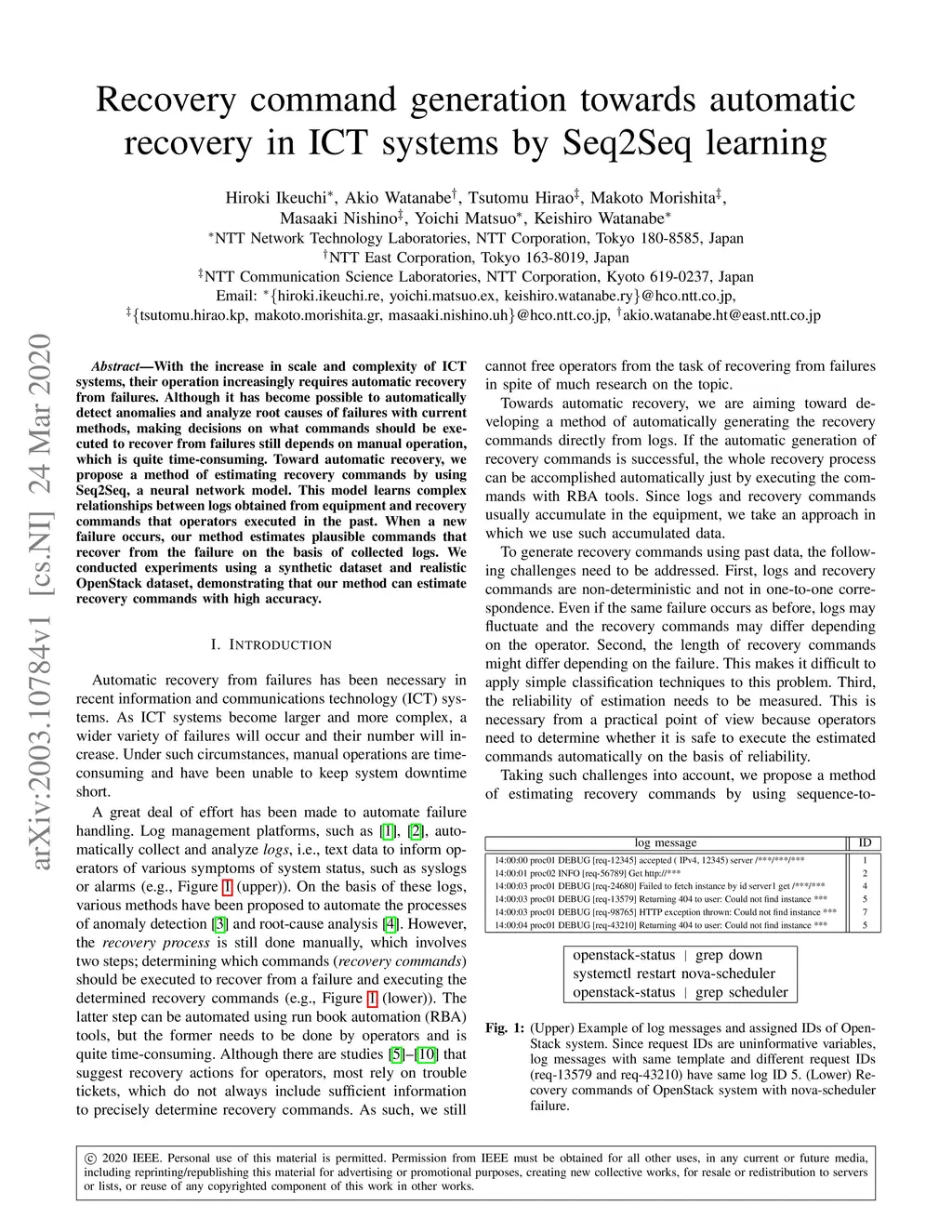 With the increase in scale and complexity of ICT systems, their operation increasingly requires automatic recovery from failures. Although it has become possible to automatically detect anomalies and analyze root causes of failures with current methods, making decisions on what commands should be executed to recover from failures still depends on manual operation, which is quite time-consuming. Toward automatic recovery, we propose a method of estimating recovery commands by using Seq2Seq, a neural network model. This model learns complex relationships between logs obtained from equipment and recovery commands that operators executed in the past. When a new failure occurs, our method estimates plausible commands that recover from the failure on the basis of collected logs. We conducted experiments using a synthetic dataset and realistic OpenStack dataset, demonstrating that our method can estimate recovery commands with high accuracy.