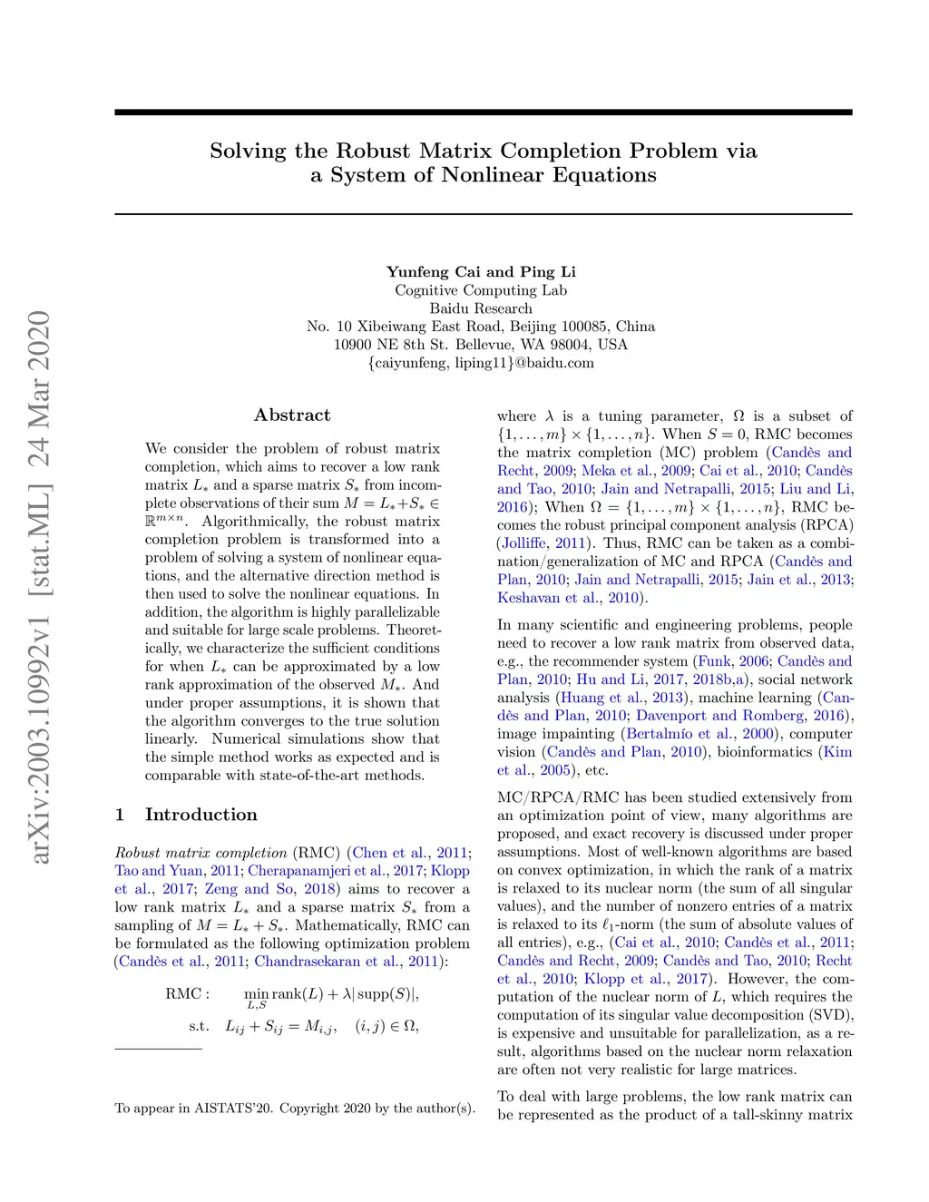 Solving the Robust Matrix Completion Problem via a System of Nonlinear