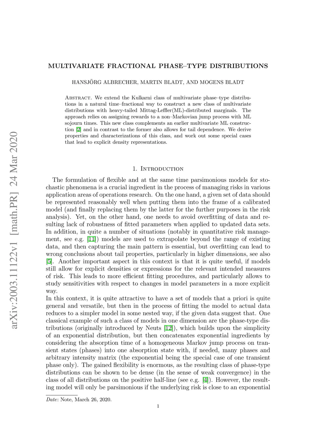 We extend the Kulkarni class of multivariate phase--type distributions in a natural time--fractional way to construct a new class of multivariate distributions with heavy-tailed Mittag-Leffler(ML)-distributed marginals. The approach relies on assigning rewards to a non--Mar\-ko\-vi\-an jump process with ML sojourn times. This new class complements an earlier multivariate ML construction \cite{multiml} and in contrast to the former also allows for tail dependence. We derive properties and characterizations of this class, and work out some special cases that lead to explicit density representations.