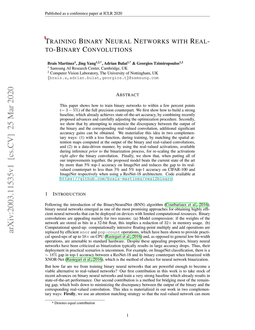 This paper shows how to train binary networks to within a few percent points () of the full precision counterpart. We first show how to build a strong baseline, which already achieves state-of-the-art accuracy, by combining recently proposed advances and carefully adjusting the optimization procedure. Secondly, we show that by attempting to minimize the discrepancy between the output of the binary and the corresponding real-valued convolution, additional significant accuracy gains can be obtained. We materialize this idea in two complementary ways: (1) with a loss function, during training, by matching the spatial attention maps computed at the output of the binary and real-valued convolutions, and (2) in a data-driven manner, by using the real-valued activations, available during inference prior to the binarization process, for re-scaling the activations right after the binary convolution. Finally, we show that, when putting all of our improvements together, the proposed model beats the current state of the art by more than 5% top-1 accuracy on ImageNet and reduces the gap to its real-valued counterpart to less than 3% and 5% top-1 accuracy on CIFAR-100 and ImageNet respectively when using a ResNet-18 architecture. Code available at https://github.com/brais-martinez/real2binary.