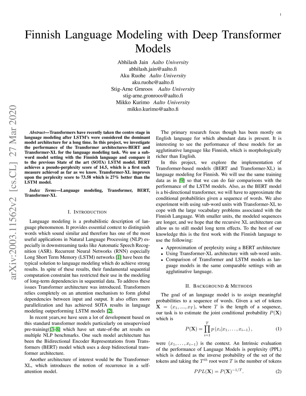 Transformers have recently taken the center stage in language modeling after LSTM's were considered the dominant model architecture for a long time. In this project, we investigate the performance of the Transformer architectures-BERT and Transformer-XL for the language modeling task. We use a sub-word model setting with the Finnish language and compare it to the previous State of the art (SOTA) LSTM model. BERT achieves a pseudo-perplexity score of 14.5, which is the first such measure achieved as far as we know. Transformer-XL improves upon the perplexity score to 73.58 which is 27\% better than the LSTM model.