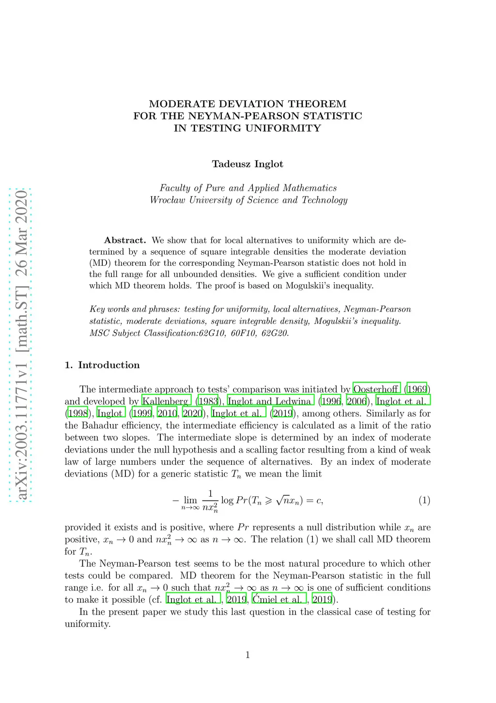 We show that for local alternatives to uniformity which are determined by a sequence of square integrable densities the moderate deviation (MD) theorem for the corresponding Neyman-Pearson statistic does not hold in the full range for all unbounded densities. We give a sufficient condition under which MD theorem holds. The proof is based on Mogulskii's inequality.