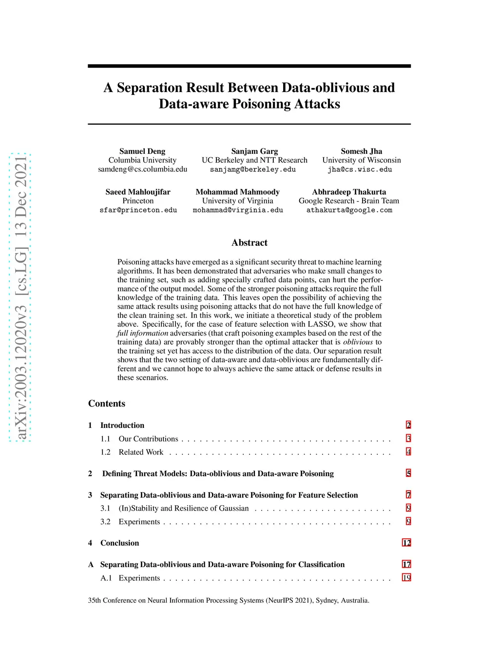 Poisoning attacks have emerged as a significant security threat to machine learning algorithms. It has been demonstrated that adversaries who make small changes to the training set, such as adding specially crafted data points, can hurt the performance of the output model. Some of the stronger poisoning attacks require the full knowledge of the training data. This leaves open the possibility of achieving the same attack results using poisoning attacks that do not have the full knowledge of the clean training set. In this work, we initiate a theoretical study of the problem above. Specifically, for the case of feature selection with LASSO, we show that full-information adversaries (that craft poisoning examples based on the rest of the training data) are provably stronger than the optimal attacker that is oblivious to the training set yet has access to the distribution of the data. Our separation result shows that the two setting of data-aware and data-oblivious are fundamentally different and we cannot hope to always achieve the same attack or defense results in these scenarios.