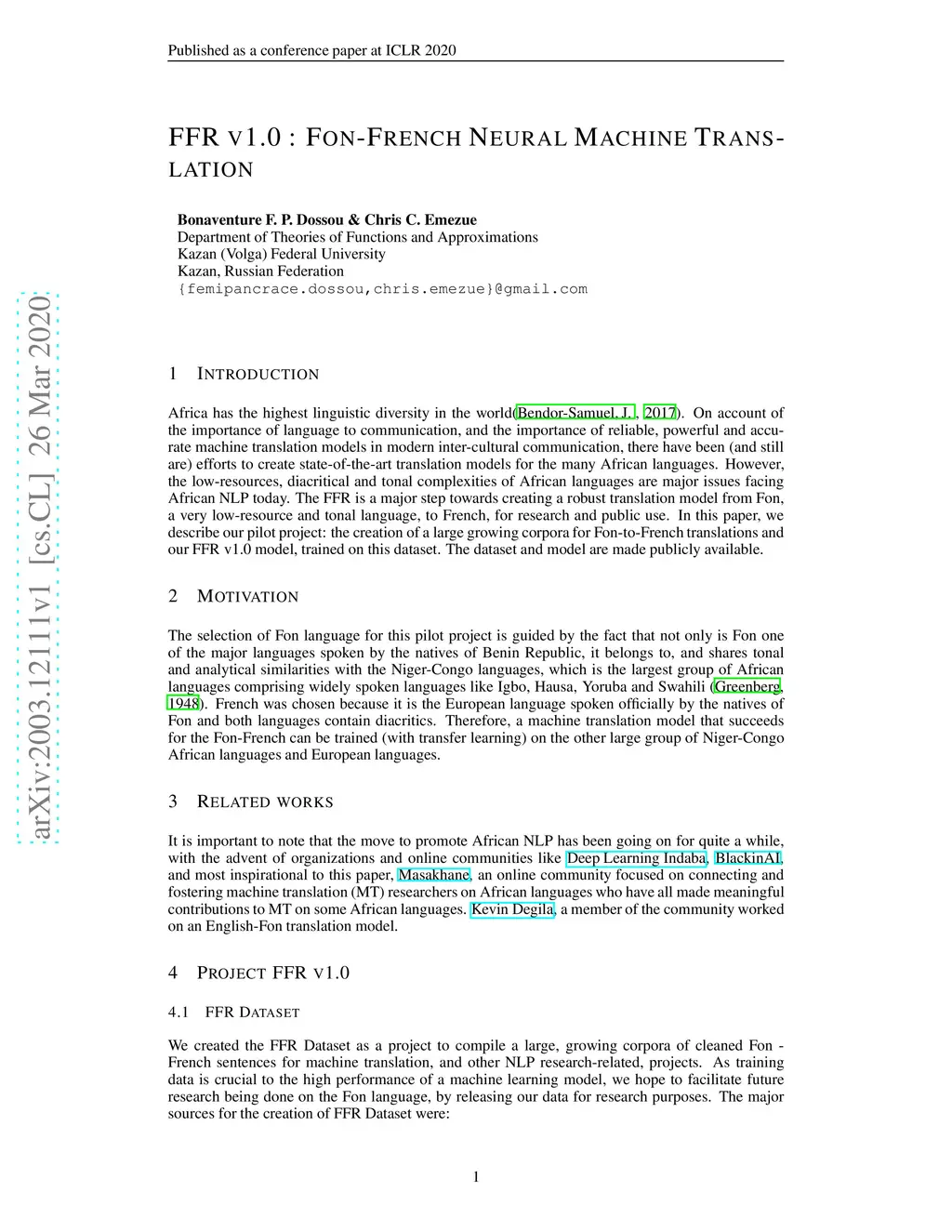 FFR V1.0: Fon-French Neural Machine Translation