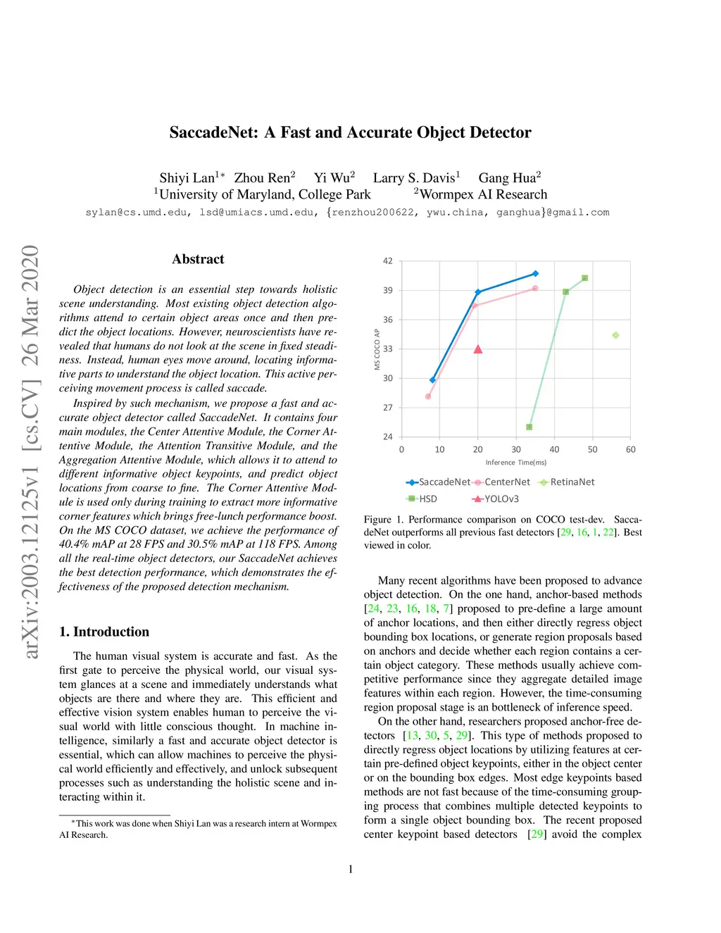 Object detection is an essential step towards holistic scene understanding. Most existing object detection algorithms attend to certain object areas once and then predict the object locations. However, neuroscientists have revealed that humans do not look at the scene in fixed steadiness. Instead, human eyes move around, locating informative parts to understand the object location. This active perceiving movement process is called \textit{saccade}. %In this paper, Inspired by such mechanism, we propose a fast and accurate object detector called \textit{SaccadeNet}. It contains four main modules, the \cenam, the \coram, the \atm, and the \aggatt, which allows it to attend to different informative object keypoints, and predict object locations from coarse to fine. The \coram~is used only during training to extract more informative corner features which brings free-lunch performance boost. On the MS COCO dataset, we achieve the performance of 40.4\% mAP at 28 FPS and 30.5\% mAP at 118 FPS. Among all the real-time object detectors, %that can run faster than 25 FPS, our SaccadeNet achieves the best detection performance, which demonstrates the effectiveness of the proposed detection mechanism.