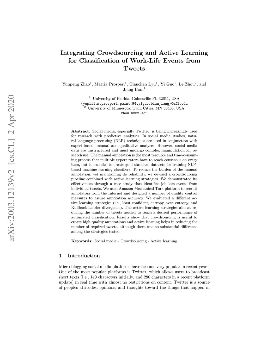 Social media, especially Twitter, is being increasingly used for research with predictive analytics. In social media studies, natural language processing (NLP) techniques are used in conjunction with expert-based, manual and qualitative analyses. However, social media data are unstructured and must undergo complex manipulation for research use. The manual annotation is the most resource and time-consuming process that multiple expert raters have to reach consensus on every item, but is essential to create gold-standard datasets for training NLP-based machine learning classifiers. To reduce the burden of the manual annotation, yet maintaining its reliability, we devised a crowdsourcing pipeline combined with active learning strategies. We demonstrated its effectiveness through a case study that identifies job loss events from individual tweets. We used Amazon Mechanical Turk platform to recruit annotators from the Internet and designed a number of quality control measures to assure annotation accuracy. We evaluated 4 different active learning strategies (i.e., least confident, entropy, vote entropy, and Kullback-Leibler divergence). The active learning strategies aim at reducing the number of tweets needed to reach a desired performance of automated classification. Results show that crowdsourcing is useful to create high-quality annotations and active learning helps in reducing the number of required tweets, although there was no substantial difference among the strategies tested.