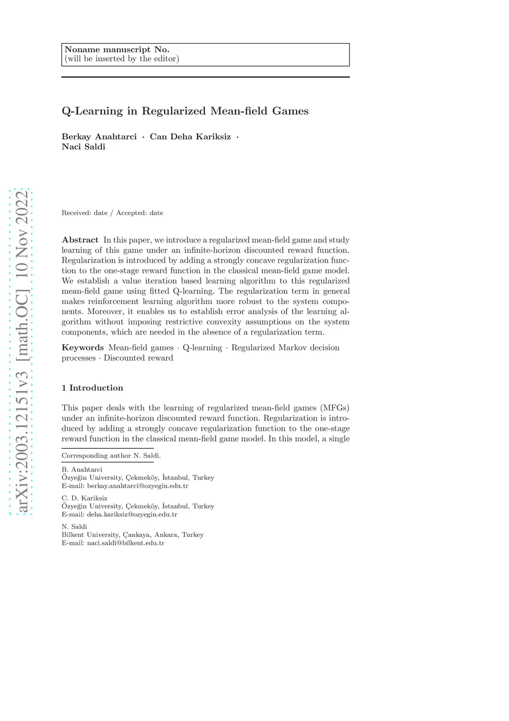 In this paper, we introduce a regularized mean-field game and study learning of this game under an infinite-horizon discounted reward function. Regularization is introduced by adding a strongly concave regularization function to the one-stage reward function in the classical mean-field game model. We establish a value iteration based learning algorithm to this regularized mean-field game using fitted Q-learning. The regularization term in general makes reinforcement learning algorithm more robust to the system components. Moreover, it enables us to establish error analysis of the learning algorithm without imposing restrictive convexity assumptions on the system components, which are needed in the absence of a regularization term.