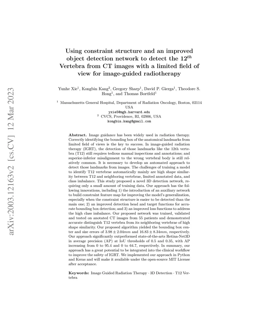 Image guidance has been widely used in radiation therapy. Correctly identifying the bounding box of the anatomical landmarks from limited field of views is the key to success. In image-guided radiation therapy (IGRT), the detection of those landmarks like the 12th vertebra (T12) still requires tedious manual inspections and annotations; and superior-inferior misalignment to the wrong vertebral body is still relatively common. It is necessary to develop an automated approach to detect those landmarks from images. The challenges of training a model to identify T12 vertebrae automatically mainly are high shape similarity between T12 and neighboring vertebrae, limited annotated data, and class imbalance. This study proposed a novel 3D detection network, requiring only a small amount of training data. Our approach has the following innovations, including 1) the introduction of an auxiliary network to build constraint feature map for improving the model's generalization, especially when the constraint structure is easier to be detected than the main one; 2) an improved detection head and target functions for accurate bounding box detection; and 3) an improved loss functions to address the high class imbalance. Our proposed network was trained, validated and tested on anotated CT images from 55 patients and demonstrated accurate distinguish T12 vertebra from its neighboring vertebrae of high shape similarity. Our proposed algorithm yielded the bounding box center and size errors of 3.98\pm2.04mm and 16.83\pm8.34mm, respectively. Our approach significantly outperformed state-of-the-arts Retina-Net3D in average precision (AP) at IoU thresholds of 0.35 and 0.5, with AP increasing from 0 to 95.4 and 0 to 64.7, respectively. In summary, our approach has a great potential to be integrated into the clinical workflow to improve the safety of IGRT.