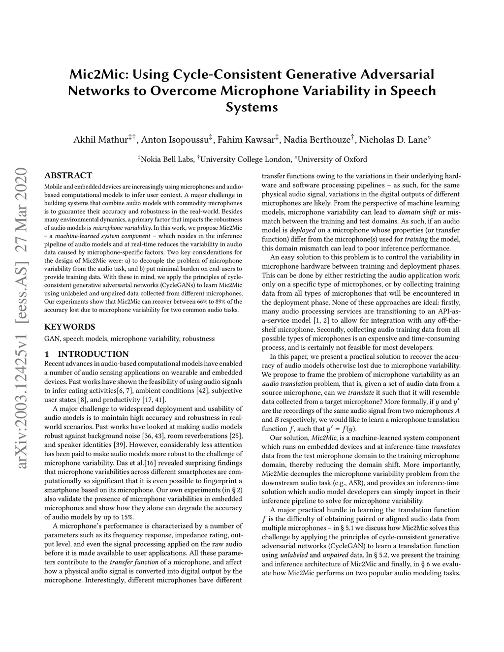 Mobile and embedded devices are increasingly using microphones and audio-based computational models to infer user context. A major challenge in building systems that combine audio models with commodity microphones is to guarantee their accuracy and robustness in the real-world. Besides many environmental dynamics, a primary factor that impacts the robustness of audio models is microphone variability. In this work, we propose Mic2Mic -- a machine-learned system component -- which resides in the inference pipeline of audio models and at real-time reduces the variability in audio data caused by microphone-specific factors. Two key considerations for the design of Mic2Mic were: a) to decouple the problem of microphone variability from the audio task, and b) put a minimal burden on end-users to provide training data. With these in mind, we apply the principles of cycle-consistent generative adversarial networks (CycleGANs) to learn Mic2Mic using unlabeled and unpaired data collected from different microphones. Our experiments show that Mic2Mic can recover between 66% to 89% of the accuracy lost due to microphone variability for two common audio tasks.