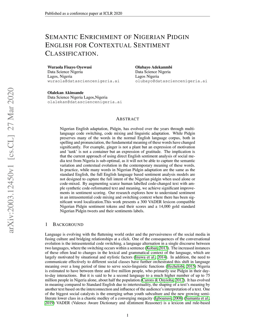 Semantic Enrichment of Nigerian Pidgin English for Contextual Sentiment