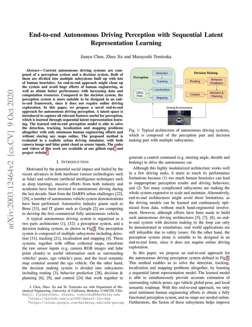 Current autonomous driving systems are composed of a perception system and a decision system. Both of them are divided into multiple subsystems built up with lots of human heuristics. An end-to-end approach might clean up the system and avoid huge efforts of human engineering, as well as obtain better performance with increasing data and computation resources. Compared to the decision system, the perception system is more suitable to be designed in an end-to-end framework, since it does not require online driving exploration. In this paper, we propose a novel end-to-end approach for autonomous driving perception. A latent space is introduced to capture all relevant features useful for perception, which is learned through sequential latent representation learning. The learned end-to-end perception model is able to solve the detection, tracking, localization and mapping problems altogether with only minimum human engineering efforts and without storing any maps online. The proposed method is evaluated in a realistic urban driving simulator, with both camera image and lidar point cloud as sensor inputs. The codes and videos of this work are available at our github repo and project website.