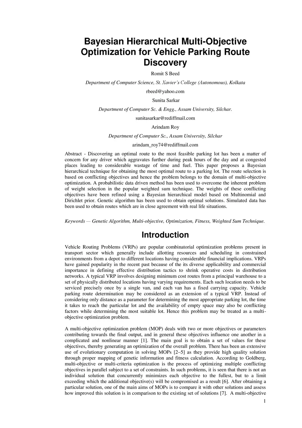 Discovering an optimal route to the most feasible parking lot has been a matter of concern for any driver which aggravates further during peak hours of the day and at congested places leading to considerable wastage of time and fuel. This paper proposes a Bayesian hierarchical technique for obtaining the most optimal route to a parking lot. The route selection is based on conflicting objectives and hence the problem belongs to the domain of multi-objective optimization. A probabilistic data driven method has been used to overcome the inherent problem of weight selection in the popular weighted sum technique. The weights of these conflicting objectives have been refined using a Bayesian hierarchical model based on Multinomial and Dirichlet prior. Genetic algorithm has been used to obtain optimal solutions. Simulated data has been used to obtain routes which are in close agreement with real life situations.