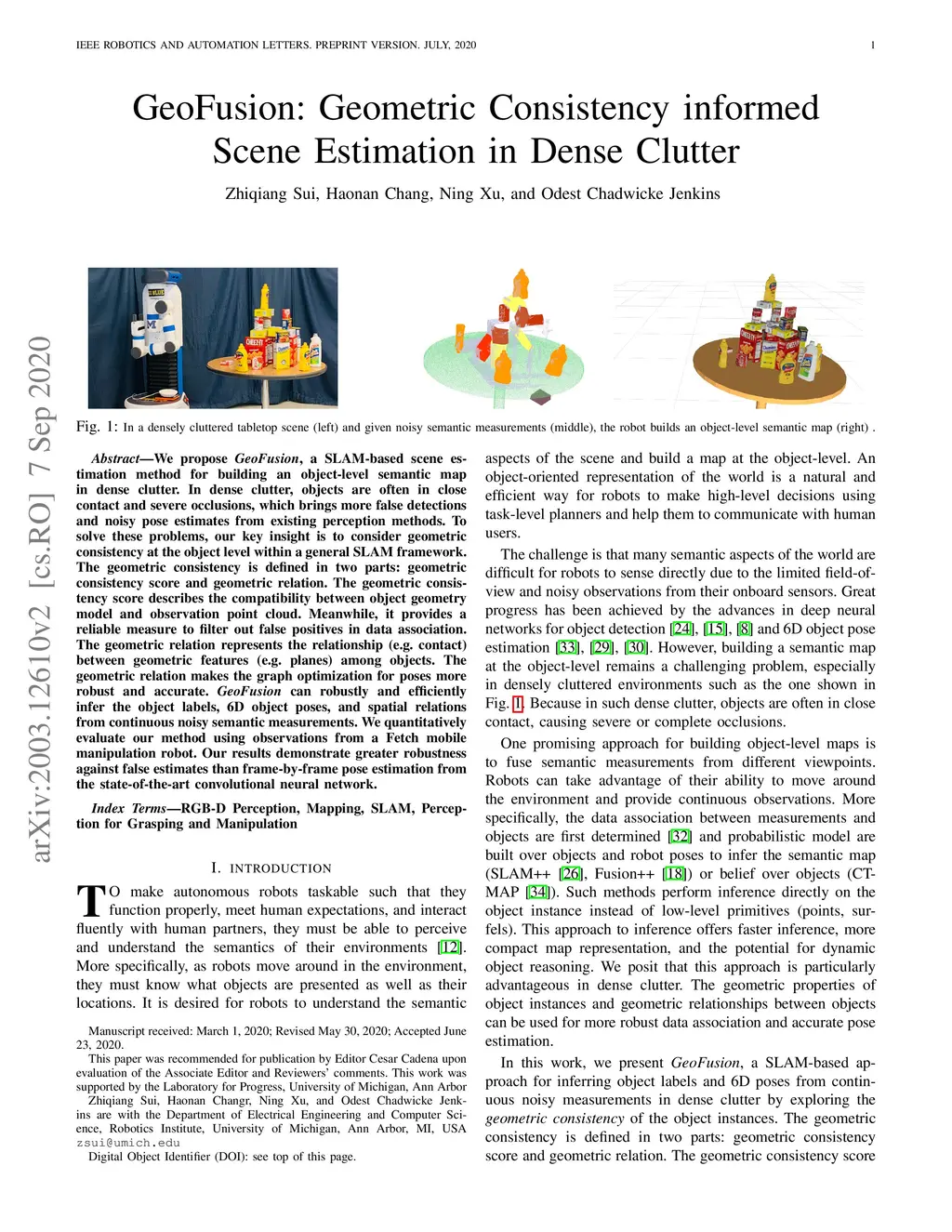 We propose GeoFusion, a SLAM-based scene estimation method for building an object-level semantic map in dense clutter. In dense clutter, objects are often in close contact and severe occlusions, which brings more false detections and noisy pose estimates from existing perception methods. To solve these problems, our key insight is to consider geometric consistency at the object level within a general SLAM framework. The geometric consistency is defined in two parts: geometric consistency score and geometric relation. The geometric consistency score describes the compatibility between object geometry model and observation point cloud. Meanwhile, it provides a reliable measure to filter out false positives in data association. The geometric relation represents the relationship (e.g. contact) between geometric features (e.g. planes) among objects. The geometric relation makes the graph optimization for poses more robust and accurate. GeoFusion can robustly and efficiently infer the object labels, 6D object poses, and spatial relations from continuous noisy semantic measurements. We quantitatively evaluate our method using observations from a Fetch mobile manipulation robot. Our results demonstrate greater robustness against false estimates than frame-by-frame pose estimation from the state-of-the-art convolutional neural network.