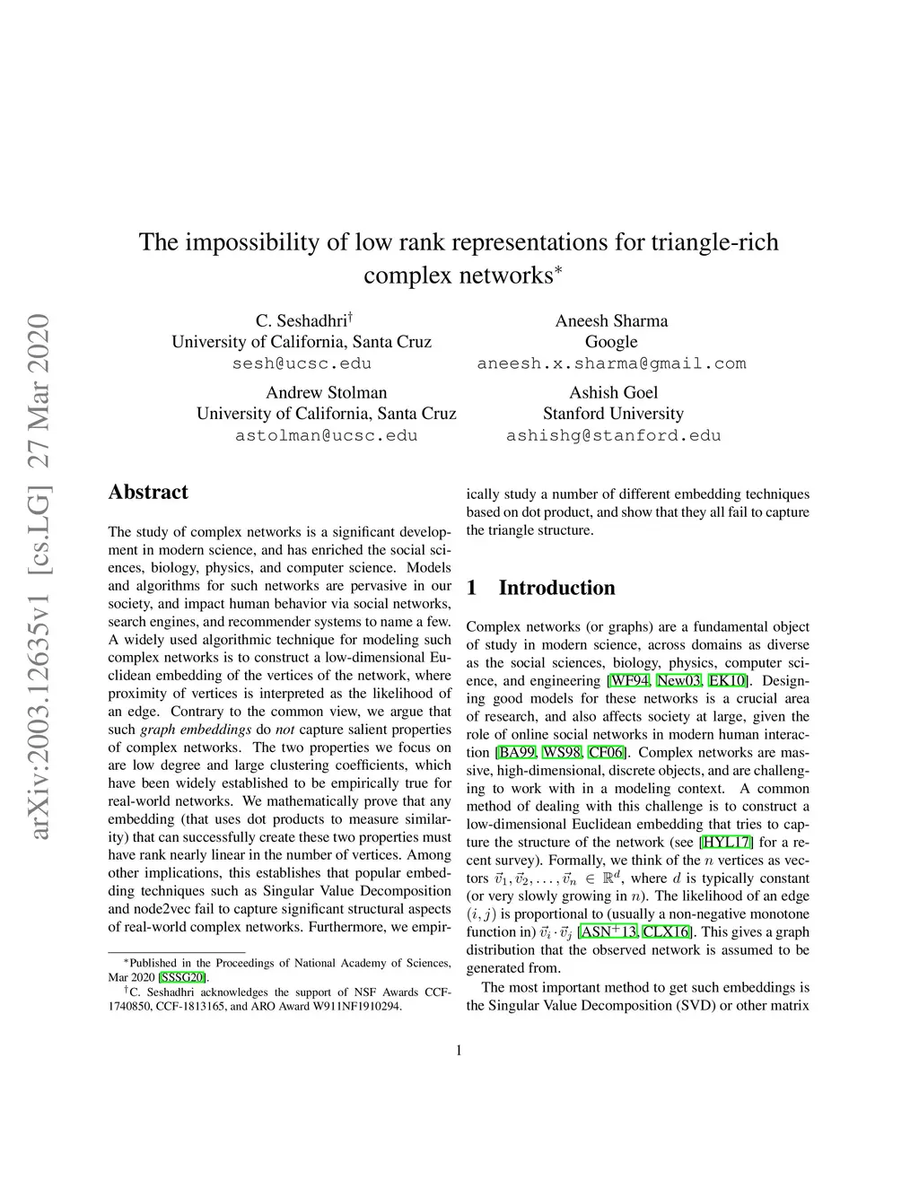 The study of complex networks is a significant development in modern science, and has enriched the social sciences, biology, physics, and computer science. Models and algorithms for such networks are pervasive in our society, and impact human behavior via social networks, search engines, and recommender systems to name a few. A widely used algorithmic technique for modeling such complex networks is to construct a low-dimensional Euclidean embedding of the vertices of the network, where proximity of vertices is interpreted as the likelihood of an edge. Contrary to the common view, we argue that such graph embeddings do not}capture salient properties of complex networks. The two properties we focus on are low degree and large clustering coefficients, which have been widely established to be empirically true for real-world networks. We mathematically prove that any embedding (that uses dot products to measure similarity) that can successfully create these two properties must have rank nearly linear in the number of vertices. Among other implications, this establishes that popular embedding techniques such as Singular Value Decomposition and node2vec fail to capture significant structural aspects of real-world complex networks. Furthermore, we empirically study a number of different embedding techniques based on dot product, and show that they all fail to capture the triangle structure.