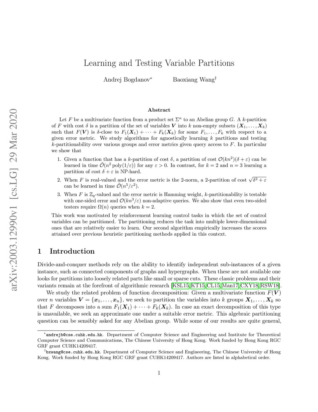 $ $Let be a multivariate function from a product set to an Abelian group . A -partition of with cost is a partition of the set of variables into non-empty subsets such that is -close to for some with respect to a given error metric. We study algorithms for agnostically learning partitions and testing -partitionability over various groups and error metrics given query access to . In particular we show that Given a function that has a -partition of cost , a partition of cost can be learned in time for any . In contrast, for and learning a partition of cost is NP-hard. When is real-valued and the error metric is the 2-norm, a 2-partition of cost can be learned in time . When is -valued and the error metric is Hamming weight, -partitionability is testable with one-sided error and non-adaptive queries. We also show that even two-sided testers require queries when . This work was motivated by reinforcement learning control tasks in which the set of control variables can be partitioned. The partitioning reduces the task into multiple lower-dimensional ones that are relatively easier to learn. Our second algorithm empirically increases the scores attained over previous heuristic partitioning methods applied in this context.