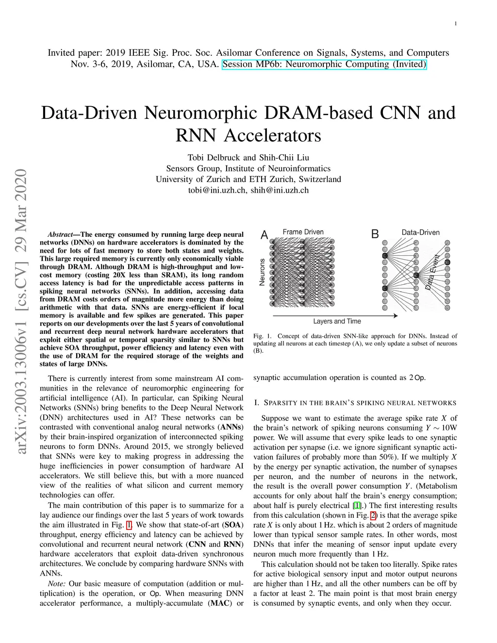 The energy consumed by running large deep neural networks (DNNs) on hardware accelerators is dominated by the need for lots of fast memory to store both states and weights. This large required memory is currently only economically viable through DRAM. Although DRAM is high-throughput and low-cost memory (costing 20X less than SRAM), its long random access latency is bad for the unpredictable access patterns in spiking neural networks (SNNs). In addition, accessing data from DRAM costs orders of magnitude more energy than doing arithmetic with that data. SNNs are energy-efficient if local memory is available and few spikes are generated. This paper reports on our developments over the last 5 years of convolutional and recurrent deep neural network hardware accelerators that exploit either spatial or temporal sparsity similar to SNNs but achieve SOA throughput, power efficiency and latency even with the use of DRAM for the required storage of the weights and states of large DNNs.