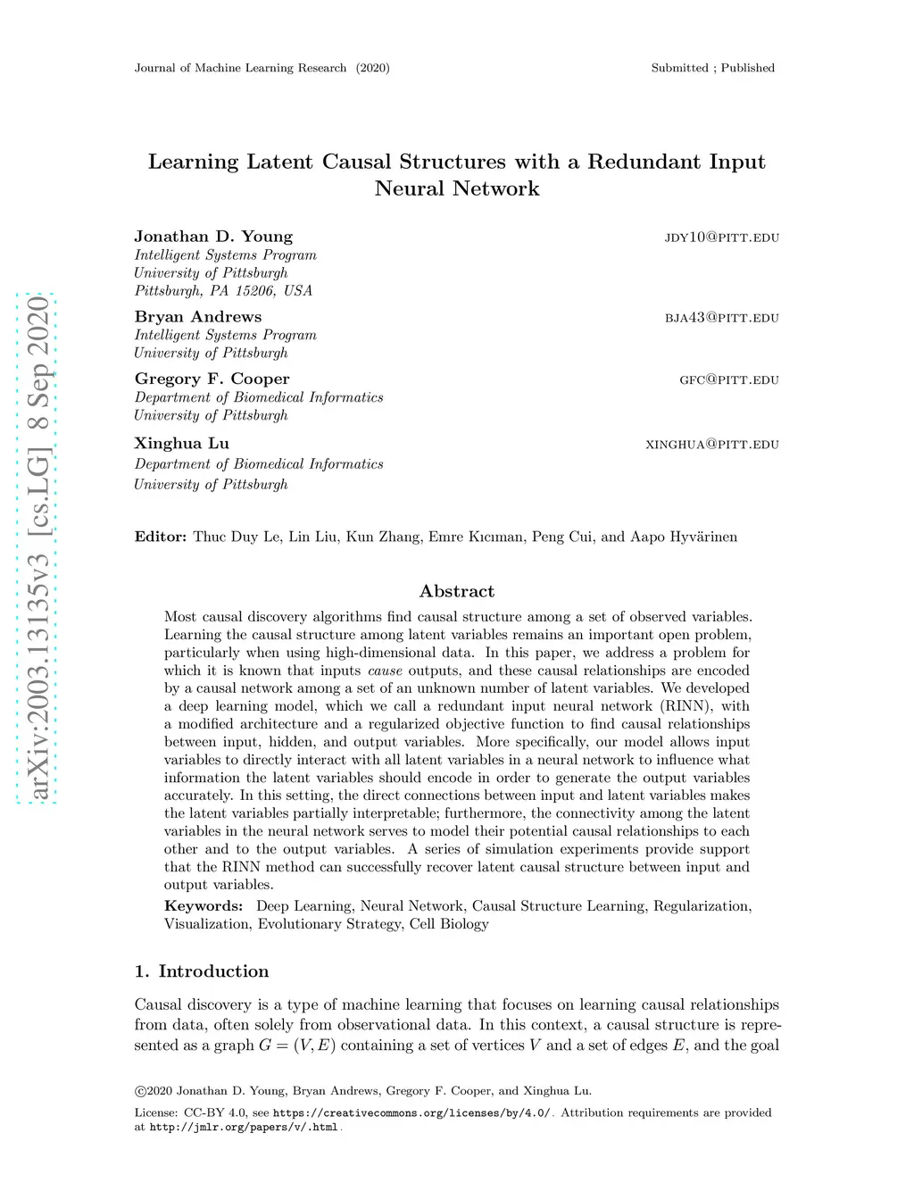 Most causal discovery algorithms find causal structure among a set of observed variables. Learning the causal structure among latent variables remains an important open problem, particularly when using high-dimensional data. In this paper, we address a problem for which it is known that inputs cause outputs, and these causal relationships are encoded by a causal network among a set of an unknown number of latent variables. We developed a deep learning model, which we call a redundant input neural network (RINN), with a modified architecture and a regularized objective function to find causal relationships between input, hidden, and output variables. More specifically, our model allows input variables to directly interact with all latent variables in a neural network to influence what information the latent variables should encode in order to generate the output variables accurately. In this setting, the direct connections between input and latent variables makes the latent variables partially interpretable; furthermore, the connectivity among the latent variables in the neural network serves to model their potential causal relationships to each other and to the output variables. A series of simulation experiments provide support that the RINN method can successfully recover latent causal structure between input and output variables.