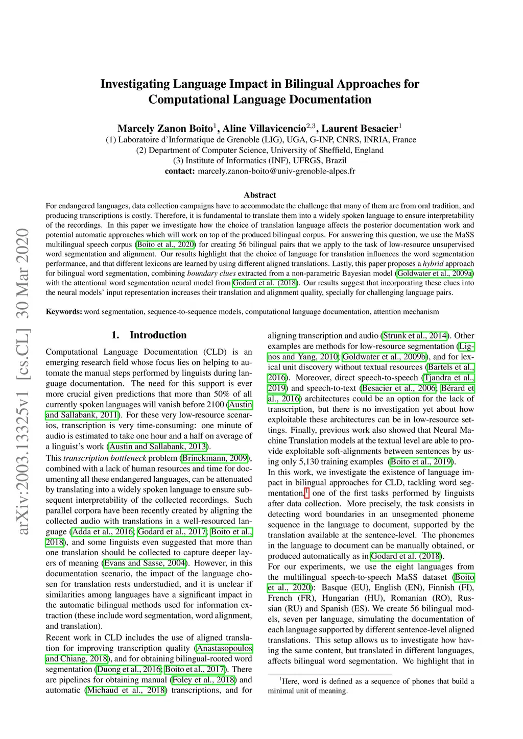 For endangered languages, data collection campaigns have to accommodate the challenge that many of them are from oral tradition, and producing transcriptions is costly. Therefore, it is fundamental to translate them into a widely spoken language to ensure interpretability of the recordings. In this paper we investigate how the choice of translation language affects the posterior documentation work and potential automatic approaches which will work on top of the produced bilingual corpus. For answering this question, we use the MaSS multilingual speech corpus (Boito et al., 2020) for creating 56 bilingual pairs that we apply to the task of low-resource unsupervised word segmentation and alignment. Our results highlight that the choice of language for translation influences the word segmentation performance, and that different lexicons are learned by using different aligned translations. Lastly, this paper proposes a hybrid approach for bilingual word segmentation, combining boundary clues extracted from a non-parametric Bayesian model (Goldwater et al., 2009a) with the attentional word segmentation neural model from Godard et al. (2018). Our results suggest that incorporating these clues into the neural models' input representation increases their translation and alignment quality, specially for challenging language pairs.