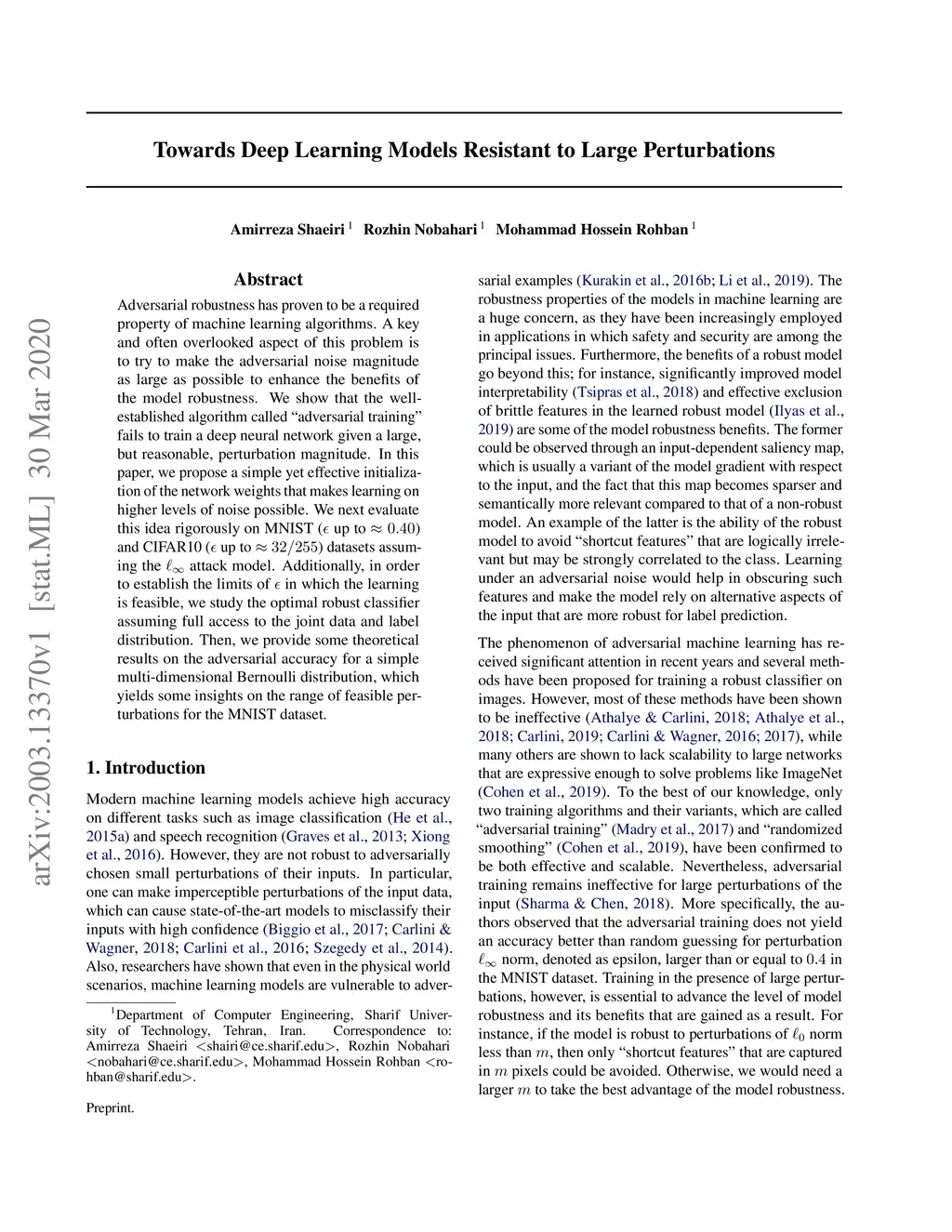 Adversarial robustness has proven to be a required property of machine learning algorithms. A key and often overlooked aspect of this problem is to try to make the adversarial noise magnitude as large as possible to enhance the benefits of the model robustness. We show that the well-established algorithm called "adversarial training" fails to train a deep neural network given a large, but reasonable, perturbation magnitude. In this paper, we propose a simple yet effective initialization of the network weights that makes learning on higher levels of noise possible. We next evaluate this idea rigorously on MNIST ( up to ) and CIFAR10 ( up to ) datasets assuming the attack model. Additionally, in order to establish the limits of in which the learning is feasible, we study the optimal robust classifier assuming full access to the joint data and label distribution. Then, we provide some theoretical results on the adversarial accuracy for a simple multi-dimensional Bernoulli distribution, which yields some insights on the range of feasible perturbations for the MNIST dataset.