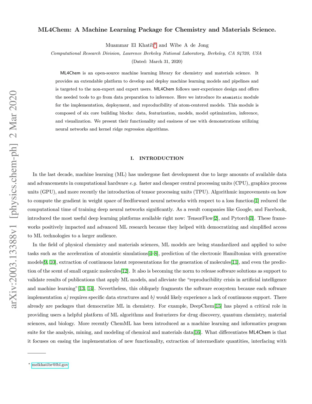 ML4Chem: A Machine Learning Package for Chemistry and Materials Science