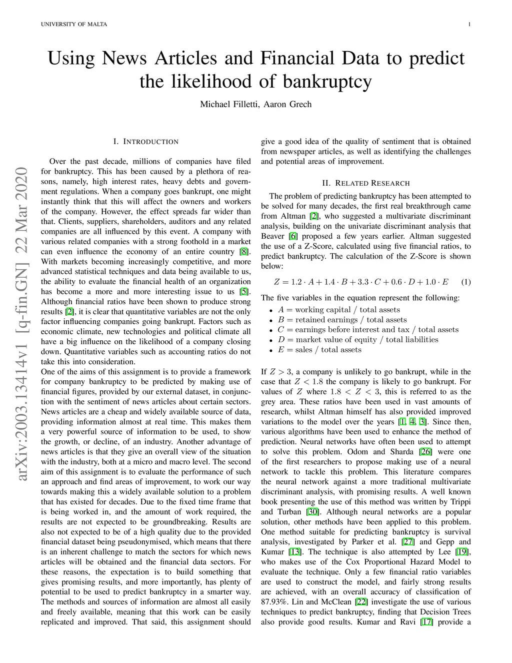 Over the past decade, millions of companies have filed for bankruptcy. This has been caused by a plethora of reasons, namely, high interest rates, heavy debts and government regulations. The effect of a company going bankrupt can be devastating, hurting not only workers and shareholders, but also clients, suppliers and any related external companies. One of the aims of this paper is to provide a framework for company bankruptcy to be predicted by making use of financial figures, provided by our external dataset, in conjunction with the sentiment of news articles about certain sectors. News articles are used to attempt to quantify the sentiment on a company and its sector from an external perspective, rather than simply using internal figures. This work builds on previous studies carried out by multiple researchers, to bring us closer to lessening the impact of such events.