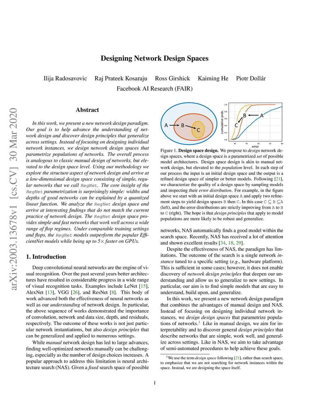 In this work, we present a new network design paradigm. Our goal is to help advance the understanding of network design and discover design principles that generalize across settings. Instead of focusing on designing individual network instances, we design network design spaces that parametrize populations of networks. The overall process is analogous to classic manual design of networks, but elevated to the design space level. Using our methodology we explore the structure aspect of network design and arrive at a low-dimensional design space consisting of simple, regular networks that we call RegNet. The core insight of the RegNet parametrization is surprisingly simple: widths and depths of good networks can be explained by a quantized linear function. We analyze the RegNet design space and arrive at interesting findings that do not match the current practice of network design. The RegNet design space provides simple and fast networks that work well across a wide range of flop regimes. Under comparable training settings and flops, the RegNet models outperform the popular EfficientNet models while being up to 5x faster on GPUs.