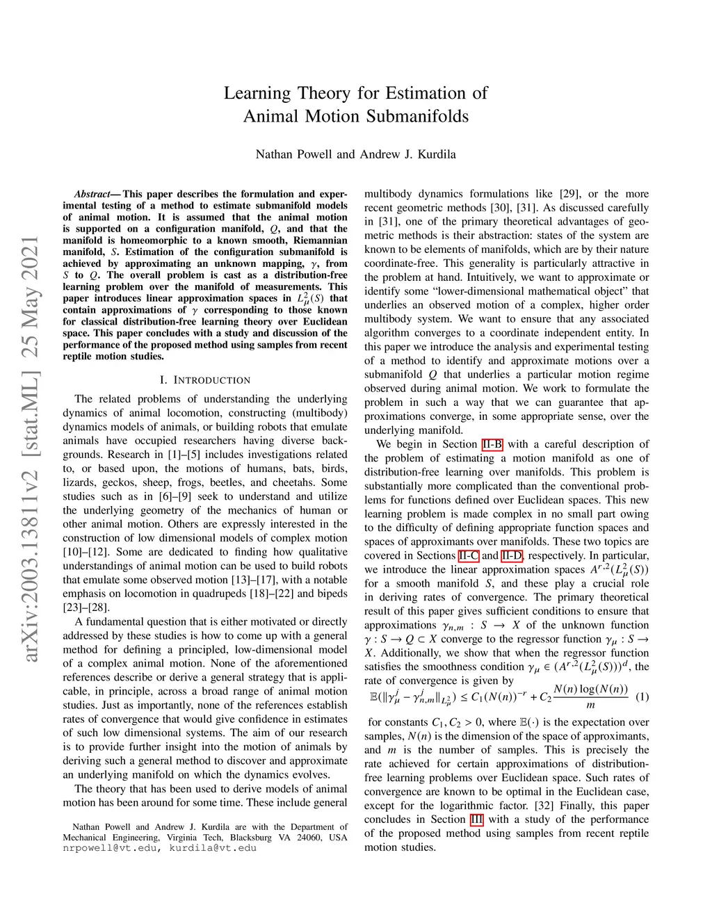 This paper describes the formulation and experimental testing of a novel method for the estimation and approximation of submanifold models of animal motion. It is assumed that the animal motion is supported on a configuration manifold that is a smooth, connected, regularly embedded Riemannian submanifold of Euclidean space for some , and that the manifold is homeomorphic to a known smooth, Riemannian manifold . Estimation of the manifold is achieved by finding an unknown mapping that maps the manifold into . The overall problem is cast as a distribution-free learning problem over the manifold of measurements . That is, it is assumed that experiments generate a finite sets of samples that are generated according to an unknown probability density on . This paper derives approximations of that are based on the samples and are contained in an dimensional space of approximants. The paper defines sufficient conditions that shows that the rates of convergence in correspond to those known for classical distribution-free learning theory over Euclidean space. Specifically, the paper derives sufficient conditions that guarantee rates of convergence that have the form for constants with the regressor function and .