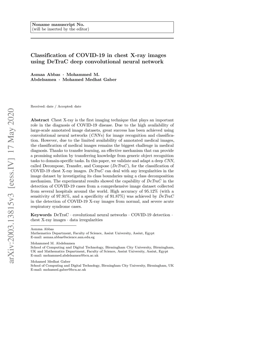 Classification of COVID-19 in chest X-ray images using DeTraC deep