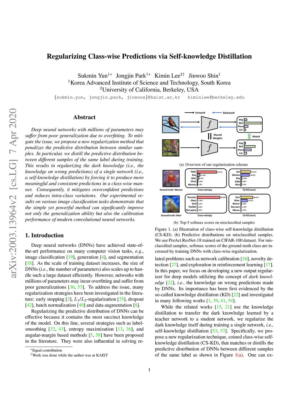 Deep neural networks with millions of parameters may suffer from poor generalization due to overfitting. To mitigate the issue, we propose a new regularization method that penalizes the predictive distribution between similar samples. In particular, we distill the predictive distribution between different samples of the same label during training. This results in regularizing the dark knowledge (i.e., the knowledge on wrong predictions) of a single network (i.e., a self-knowledge distillation) by forcing it to produce more meaningful and consistent predictions in a class-wise manner. Consequently, it mitigates overconfident predictions and reduces intra-class variations. Our experimental results on various image classification tasks demonstrate that the simple yet powerful method can significantly improve not only the generalization ability but also the calibration performance of modern convolutional neural networks.