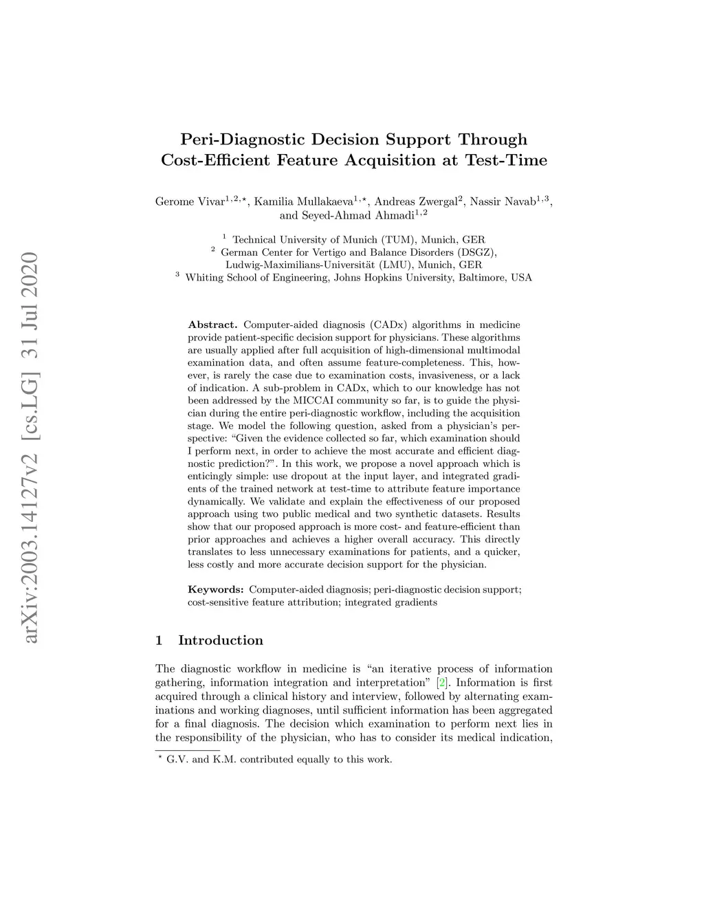Computer-aided diagnosis (CADx) algorithms in medicine provide patient-specific decision support for physicians. These algorithms are usually applied after full acquisition of high-dimensional multimodal examination data, and often assume feature-completeness. This, however, is rarely the case due to examination costs, invasiveness, or a lack of indication. A sub-problem in CADx, which to our knowledge has received very little attention among the CADx community so far, is to guide the physician during the entire peri-diagnostic workflow, including the acquisition stage. We model the following question, asked from a physician's perspective: "Given the evidence collected so far, which examination should I perform next, in order to achieve the most accurate and efficient diagnostic prediction?". In this work, we propose a novel approach which is enticingly simple: use dropout at the input layer, and integrated gradients of the trained network at test-time to attribute feature importance dynamically. We validate and explain the effectiveness of our proposed approach using two public medical and two synthetic datasets. Results show that our proposed approach is more cost- and feature-efficient than prior approaches and achieves a higher overall accuracy. This directly translates to less unnecessary examinations for patients, and a quicker, less costly and more accurate decision support for the physician.