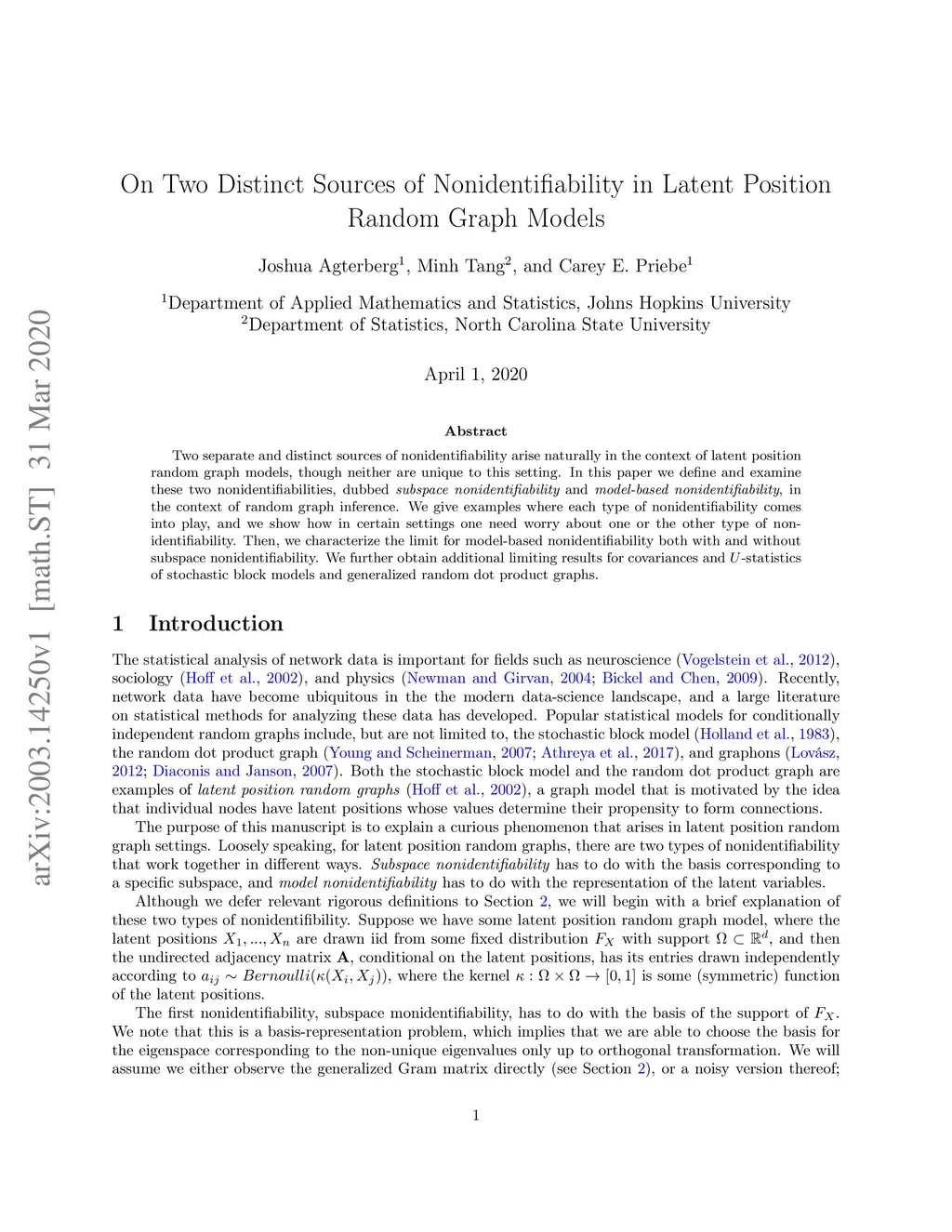 Two separate and distinct sources of nonidentifiability arise naturally in the context of latent position random graph models, though neither are unique to this setting. In this paper we define and examine these two nonidentifiabilities, dubbed subspace nonidentifiability and model-based nonidentifiability, in the context of random graph inference. We give examples where each type of nonidentifiability comes into play, and we show how in certain settings one need worry about one or the other type of nonidentifiability. Then, we characterize the limit for model-based nonidentifiability both with and without subspace nonidentifiability. We further obtain additional limiting results for covariances and -statistics of stochastic block models and generalized random dot product graphs.