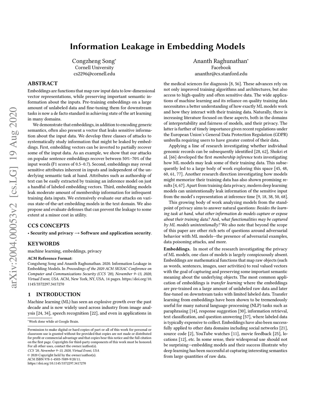 Information Leakage in Embedding Models