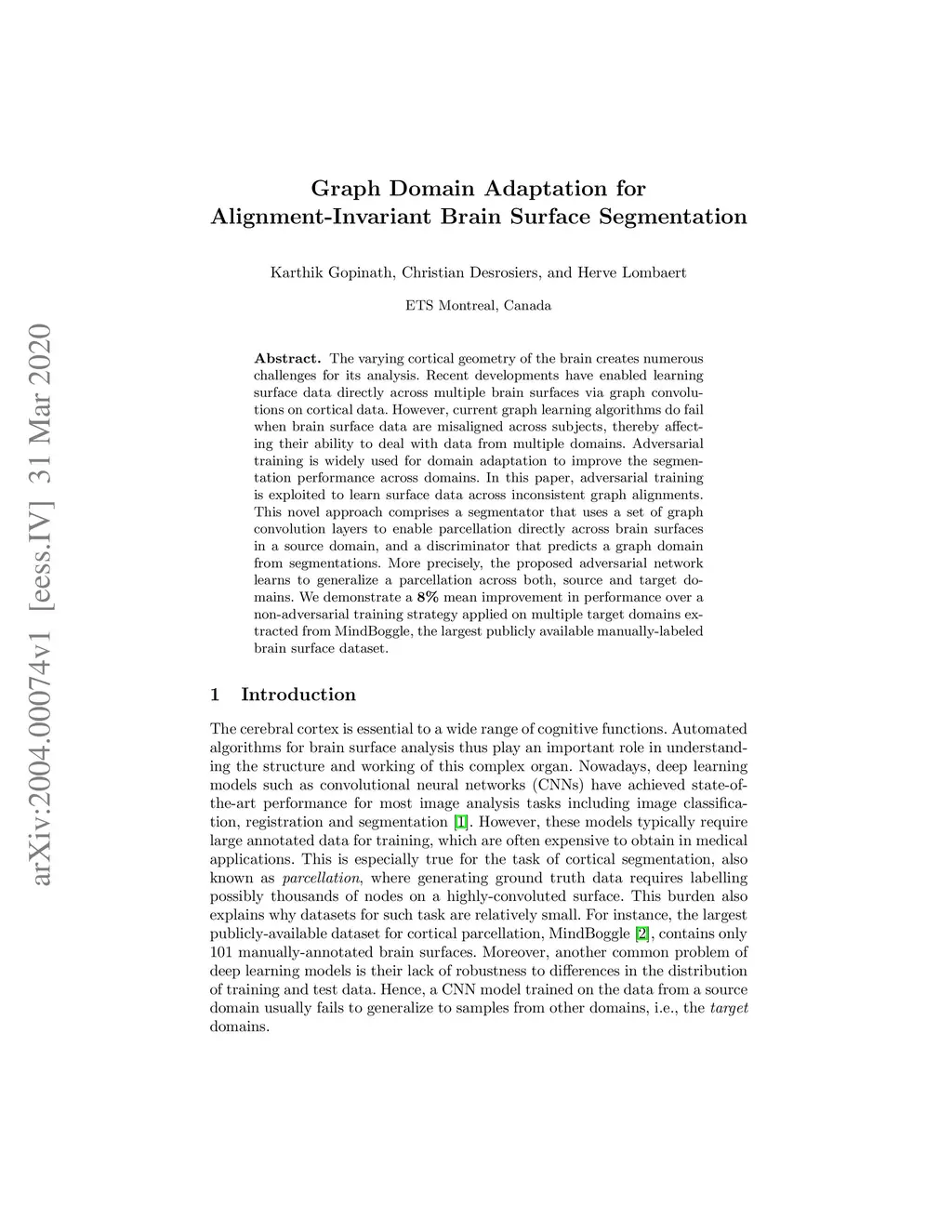 The varying cortical geometry of the brain creates numerous challenges for its analysis. Recent developments have enabled learning surface data directly across multiple brain surfaces via graph convolutions on cortical data. However, current graph learning algorithms do fail when brain surface data are misaligned across subjects, thereby affecting their ability to deal with data from multiple domains. Adversarial training is widely used for domain adaptation to improve the segmentation performance across domains. In this paper, adversarial training is exploited to learn surface data across inconsistent graph alignments. This novel approach comprises a segmentator that uses a set of graph convolution layers to enable parcellation directly across brain surfaces in a source domain, and a discriminator that predicts a graph domain from segmentations. More precisely, the proposed adversarial network learns to generalize a parcellation across both, source and target domains. We demonstrate an 8% mean improvement in performance over a non-adversarial training strategy applied on multiple target domains extracted from MindBoggle, the largest publicly available manually-labeled brain surface dataset.