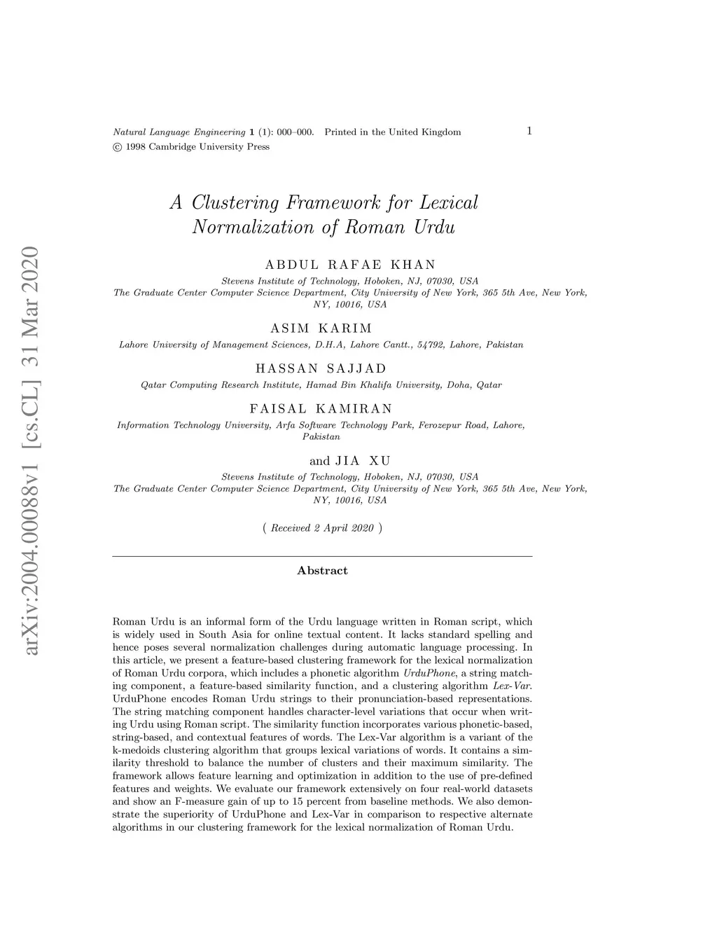 A Clustering Framework for Lexical Normalization of Roman Urdu