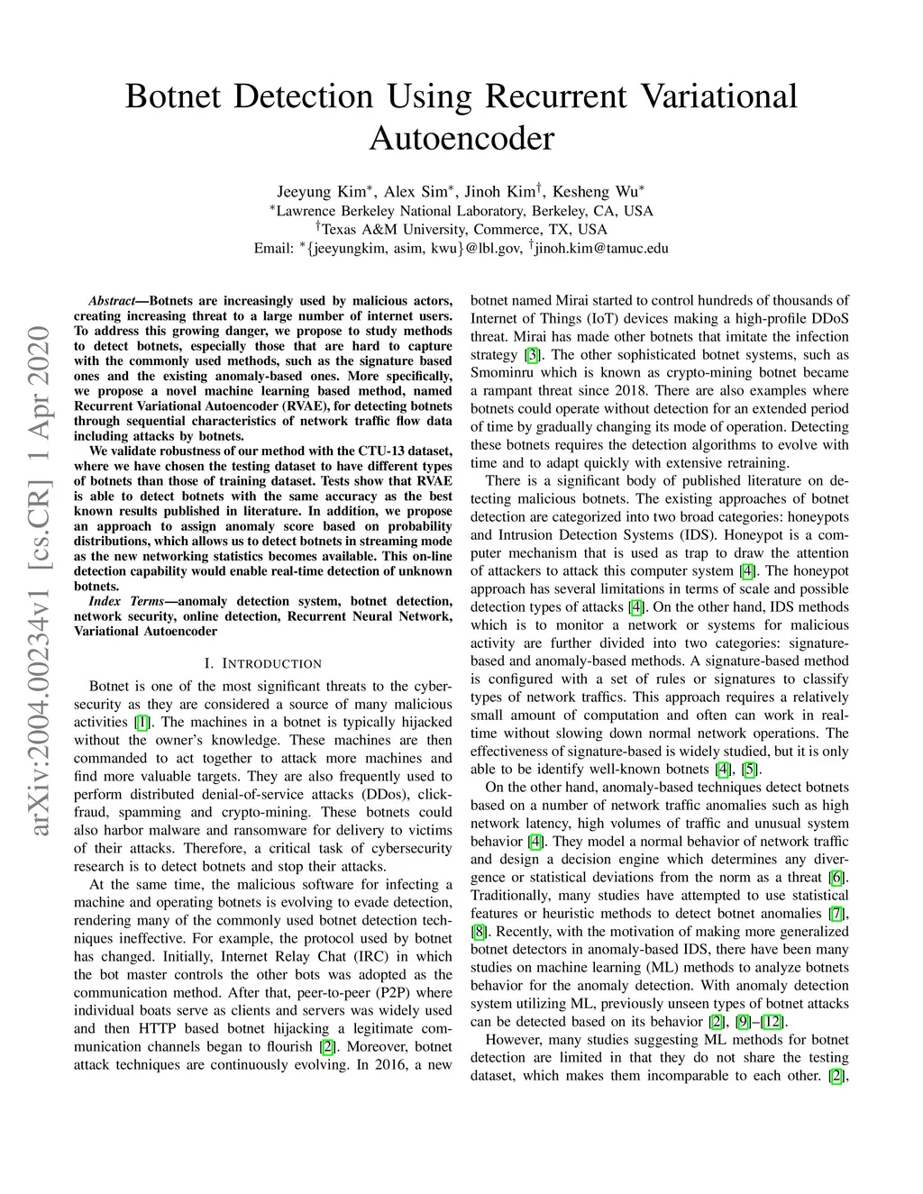 Botnets are increasingly used by malicious actors, creating increasing threat to a large number of internet users. To address this growing danger, we propose to study methods to detect botnets, especially those that are hard to capture with the commonly used methods, such as the signature based ones and the existing anomaly-based ones. More specifically, we propose a novel machine learning based method, named Recurrent Variational Autoencoder (RVAE), for detecting botnets through sequential characteristics of network traffic flow data including attacks by botnets. We validate robustness of our method with the CTU-13 dataset, where we have chosen the testing dataset to have different types of botnets than those of training dataset. Tests show that RVAE is able to detect botnets with the same accuracy as the best known results published in literature. In addition, we propose an approach to assign anomaly score based on probability distributions, which allows us to detect botnets in streaming mode as the new networking statistics becomes available. This on-line detection capability would enable real-time detection of unknown botnets.