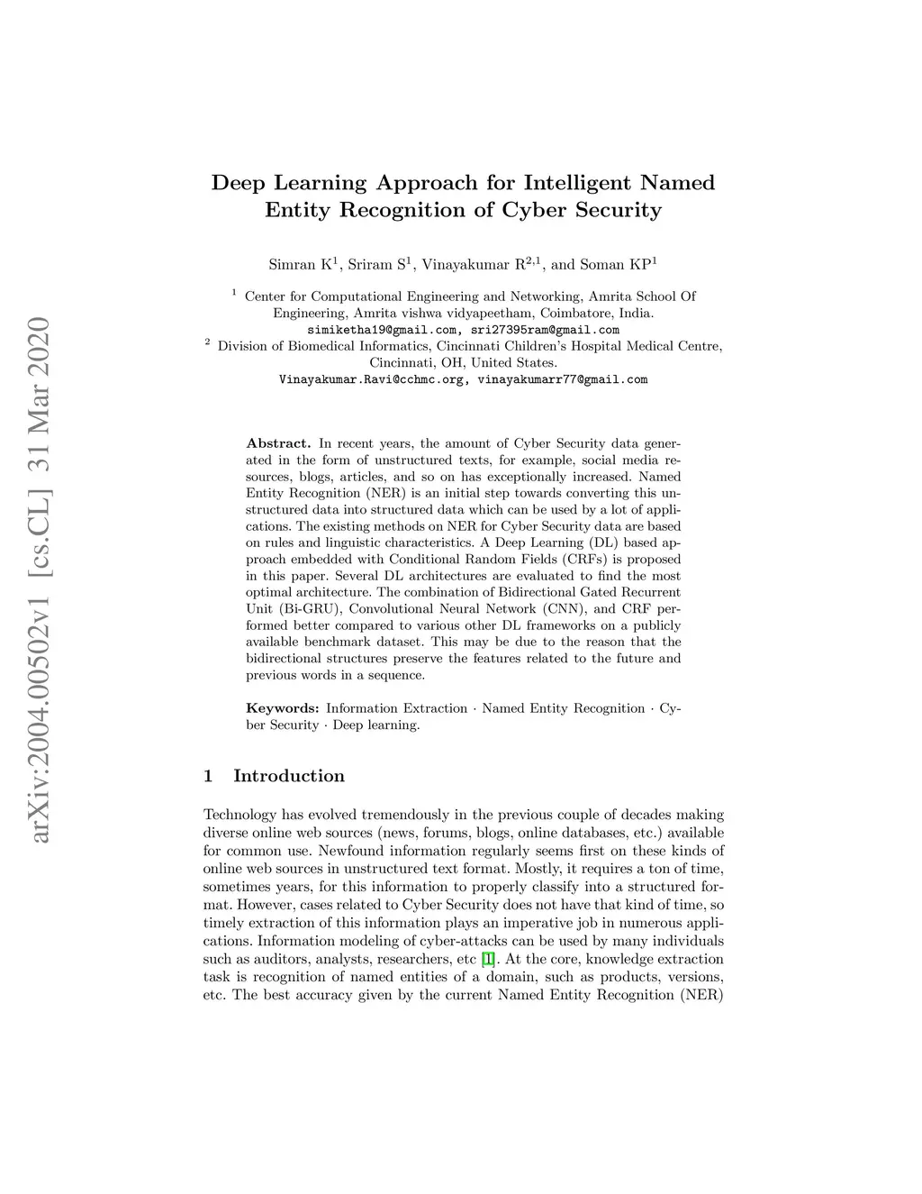 In recent years, the amount of Cyber Security data generated in the form of unstructured texts, for example, social media resources, blogs, articles, and so on has exceptionally increased. Named Entity Recognition (NER) is an initial step towards converting this unstructured data into structured data which can be used by a lot of applications. The existing methods on NER for Cyber Security data are based on rules and linguistic characteristics. A Deep Learning (DL) based approach embedded with Conditional Random Fields (CRFs) is proposed in this paper. Several DL architectures are evaluated to find the most optimal architecture. The combination of Bidirectional Gated Recurrent Unit (Bi-GRU), Convolutional Neural Network (CNN), and CRF performed better compared to various other DL frameworks on a publicly available benchmark dataset. This may be due to the reason that the bidirectional structures preserve the features related to the future and previous words in a sequence.
