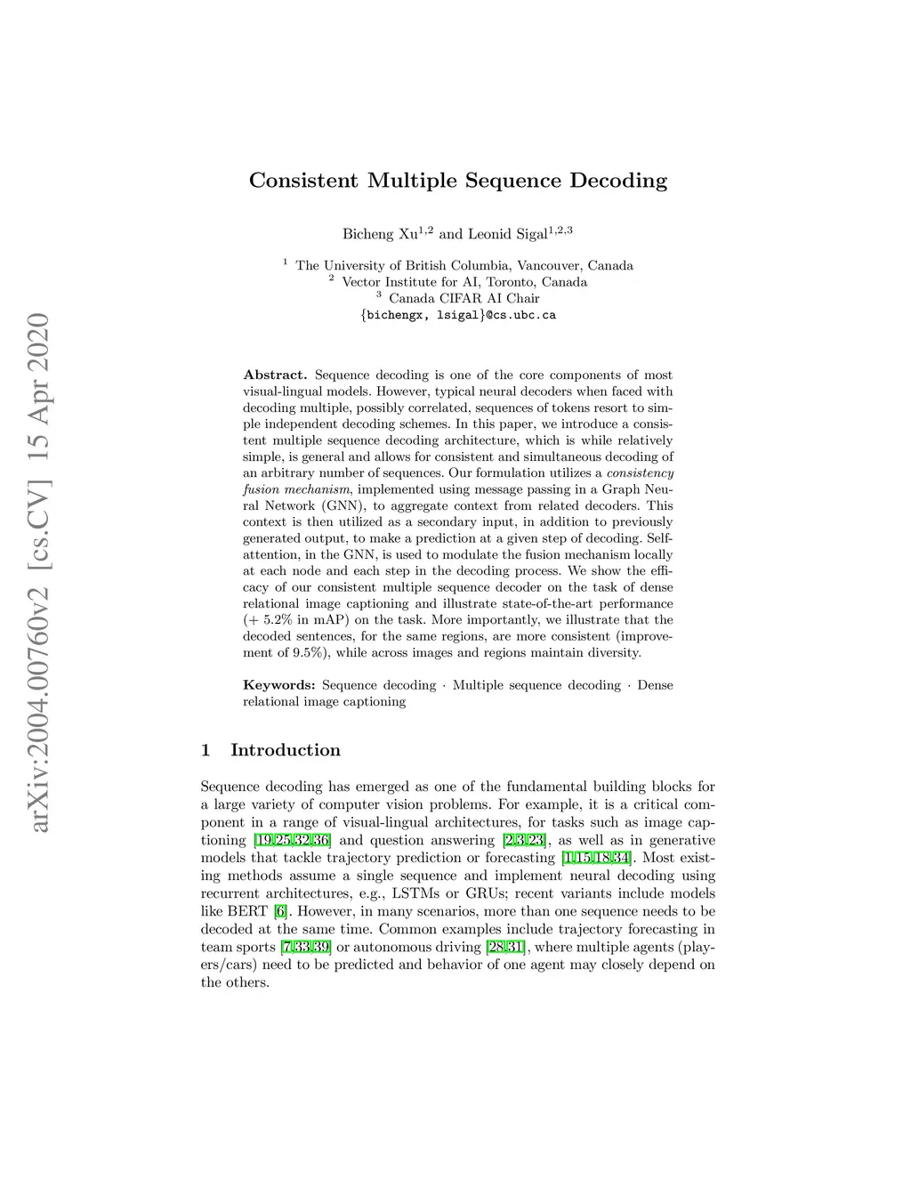 Sequence decoding is one of the core components of most visual-lingual models. However, typical neural decoders when faced with decoding multiple, possibly correlated, sequences of tokens resort to simple independent decoding schemes. In this paper, we introduce a consistent multiple sequence decoding architecture, which is while relatively simple, is general and allows for consistent and simultaneous decoding of an arbitrary number of sequences. Our formulation utilizes a consistency fusion mechanism, implemented using message passing in a Graph Neural Network (GNN), to aggregate context from related decoders. This context is then utilized as a secondary input, in addition to previously generated output, to make a prediction at a given step of decoding. Self-attention, in the GNN, is used to modulate the fusion mechanism locally at each node and each step in the decoding process. We show the efficacy of our consistent multiple sequence decoder on the task of dense relational image captioning and illustrate state-of-the-art performance (+ 5.2% in mAP) on the task. More importantly, we illustrate that the decoded sentences, for the same regions, are more consistent (improvement of 9.5%), while across images and regions maintain diversity.
