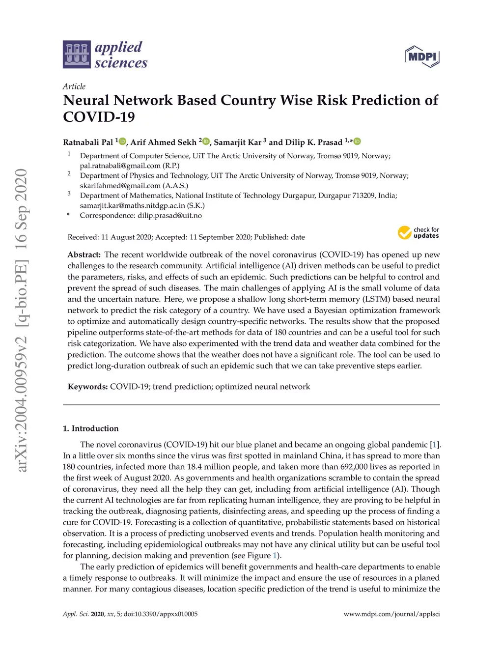 The recent worldwide outbreak of the novel coronavirus (COVID-19) has opened up new challenges to the research community. Artificial intelligence (AI) driven methods can be useful to predict the parameters, risks, and effects of such an epidemic. Such predictions can be helpful to control and prevent the spread of such diseases. The main challenges of applying AI is the small volume of data and the uncertain nature. Here, we propose a shallow long short-term memory (LSTM) based neural network to predict the risk category of a country. We have used a Bayesian optimization framework to optimize and automatically design country-specific networks. The results show that the proposed pipeline outperforms state-of-the-art methods for data of 180 countries and can be a useful tool for such risk categorization. We have also experimented with the trend data and weather data combined for the prediction. The outcome shows that the weather does not have a significant role. The tool can be used to predict long-duration outbreak of such an epidemic such that we can take preventive steps earlier