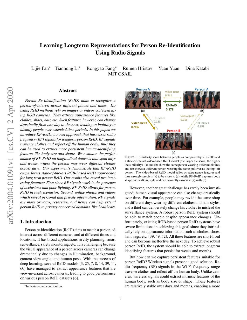 Person Re-Identification (ReID) aims to recognize a person-of-interest across different places and times. Existing ReID methods rely on images or videos collected using RGB cameras. They extract appearance features like clothes, shoes, hair, etc. Such features, however, can change drastically from one day to the next, leading to inability to identify people over extended time periods. In this paper, we introduce RF-ReID, a novel approach that harnesses radio frequency (RF) signals for longterm person ReID. RF signals traverse clothes and reflect off the human body; thus they can be used to extract more persistent human-identifying features like body size and shape. We evaluate the performance of RF-ReID on longitudinal datasets that span days and weeks, where the person may wear different clothes across days. Our experiments demonstrate that RF-ReID outperforms state-of-the-art RGB-based ReID approaches for long term person ReID. Our results also reveal two interesting features: First since RF signals work in the presence of occlusions and poor lighting, RF-ReID allows for person ReID in such scenarios. Second, unlike photos and videos which reveal personal and private information, RF signals are more privacy-preserving, and hence can help extend person ReID to privacy-concerned domains, like healthcare.
