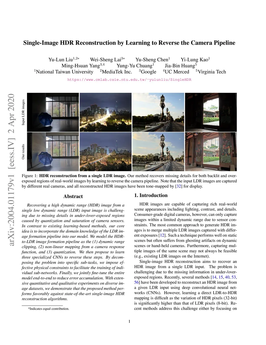 Recovering a high dynamic range (HDR) image from a single low dynamic range (LDR) input image is challenging due to missing details in under-/over-exposed regions caused by quantization and saturation of camera sensors. In contrast to existing learning-based methods, our core idea is to incorporate the domain knowledge of the LDR image formation pipeline into our model. We model the HDRto-LDR image formation pipeline as the (1) dynamic range clipping, (2) non-linear mapping from a camera response function, and (3) quantization. We then propose to learn three specialized CNNs to reverse these steps. By decomposing the problem into specific sub-tasks, we impose effective physical constraints to facilitate the training of individual sub-networks. Finally, we jointly fine-tune the entire model end-to-end to reduce error accumulation. With extensive quantitative and qualitative experiments on diverse image datasets, we demonstrate that the proposed method performs favorably against state-of-the-art single-image HDR reconstruction algorithms.