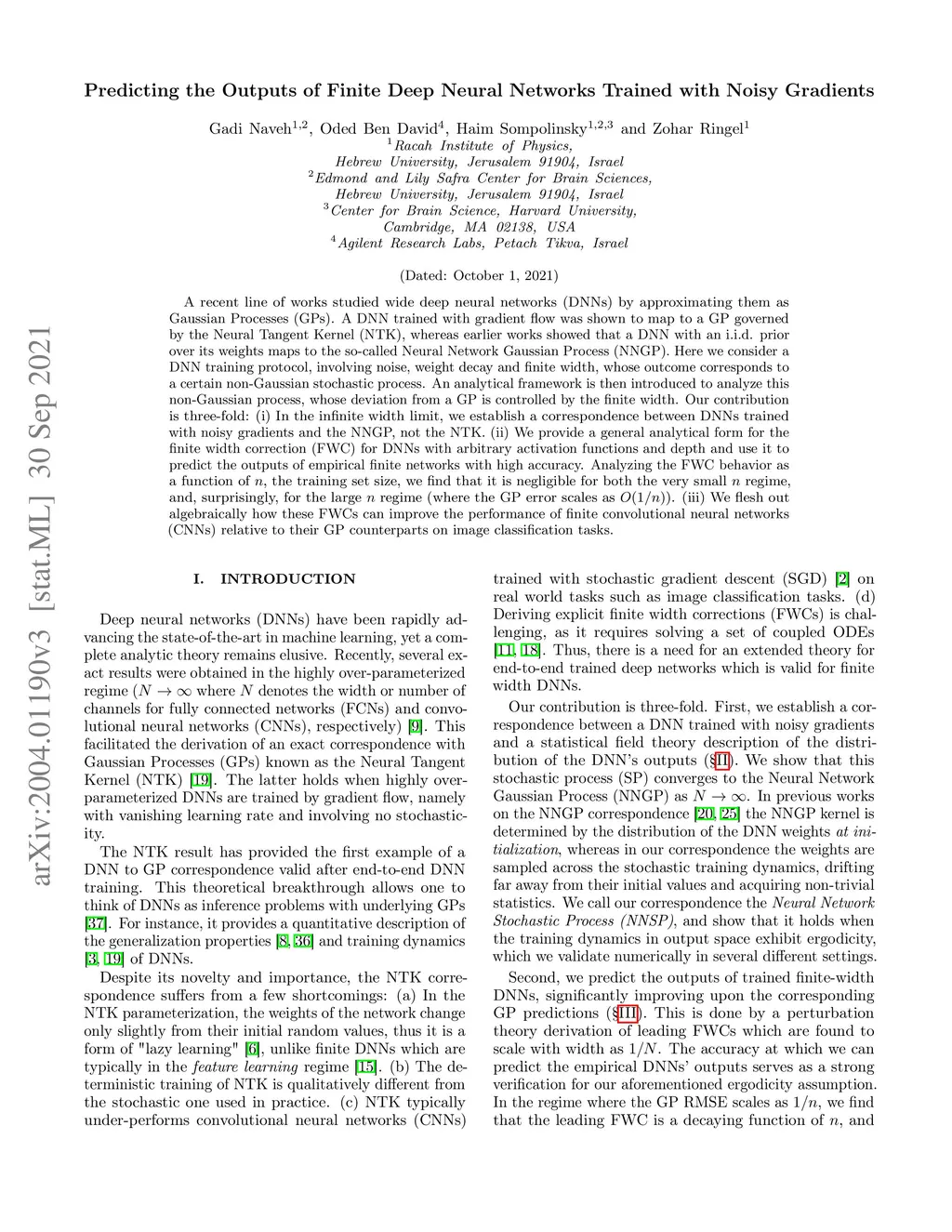 A recent line of works studied wide deep neural networks (DNNs) by approximating them as Gaussian Processes (GPs). A DNN trained with gradient flow was shown to map to a GP governed by the Neural Tangent Kernel (NTK), whereas earlier works showed that a DNN with an i.i.d. prior over its weights maps to the so-called Neural Network Gaussian Process (NNGP). Here we consider a DNN training protocol, involving noise, weight decay and finite width, whose outcome corresponds to a certain non-Gaussian stochastic process. An analytical framework is then introduced to analyze this non-Gaussian process, whose deviation from a GP is controlled by the finite width. Our contribution is three-fold: (i) In the infinite width limit, we establish a correspondence between DNNs trained with noisy gradients and the NNGP, not the NTK. (ii) We provide a general analytical form for the finite width correction (FWC) for DNNs with arbitrary activation functions and depth and use it to predict the outputs of empirical finite networks with high accuracy. Analyzing the FWC behavior as a function of , the training set size, we find that it is negligible for both the very small regime, and, surprisingly, for the large regime (where the GP error scales as ). (iii) We flesh out algebraically how these FWCs can improve the performance of finite convolutional neural networks (CNNs) relative to their GP counterparts on image classification tasks.