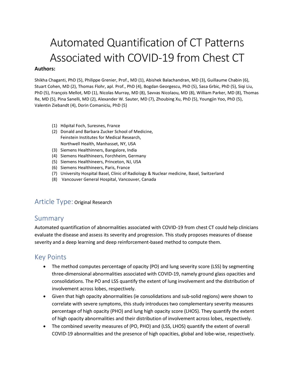 Purpose: To present a method that automatically segments and quantifies abnormal CT patterns commonly present in coronavirus disease 2019 (COVID-19), namely ground glass opacities and consolidations. Materials and Methods: In this retrospective study, the proposed method takes as input a non-contrasted chest CT and segments the lesions, lungs, and lobes in three dimensions, based on a dataset of 9749 chest CT volumes. The method outputs two combined measures of the severity of lung and lobe involvement, quantifying both the extent of COVID-19 abnormalities and presence of high opacities, based on deep learning and deep reinforcement learning. The first measure of (PO, PHO) is global, while the second of (LSS, LHOS) is lobewise. Evaluation of the algorithm is reported on CTs of 200 participants (100 COVID-19 confirmed patients and 100 healthy controls) from institutions from Canada, Europe and the United States collected between 2002-Present (April, 2020). Ground truth is established by manual annotations of lesions, lungs, and lobes. Correlation and regression analyses were performed to compare the prediction to the ground truth. Results: Pearson correlation coefficient between method prediction and ground truth for COVID-19 cases was calculated as 0.92 for PO (P < .001), 0.97 for PHO(P < .001), 0.91 for LSS (P < .001), 0.90 for LHOS (P < .001). 98 of 100 healthy controls had a predicted PO of less than 1%, 2 had between 1-2%. Automated processing time to compute the severity scores was 10 seconds per case compared to 30 minutes required for manual annotations. Conclusion: A new method segments regions of CT abnormalities associated with COVID-19 and computes (PO, PHO), as well as (LSS, LHOS) severity scores.