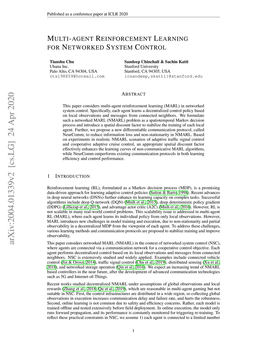 Multi-agent Reinforcement Learning for Networked System Control