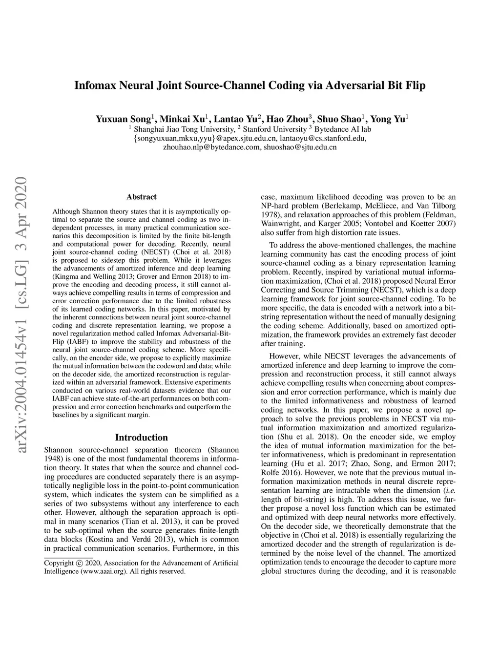 Although Shannon theory states that it is asymptotically optimal to separate the source and channel coding as two independent processes, in many practical communication scenarios this decomposition is limited by the finite bit-length and computational power for decoding. Recently, neural joint source-channel coding (NECST) is proposed to sidestep this problem. While it leverages the advancements of amortized inference and deep learning to improve the encoding and decoding process, it still cannot always achieve compelling results in terms of compression and error correction performance due to the limited robustness of its learned coding networks. In this paper, motivated by the inherent connections between neural joint source-channel coding and discrete representation learning, we propose a novel regularization method called Infomax Adversarial-Bit-Flip (IABF) to improve the stability and robustness of the neural joint source-channel coding scheme. More specifically, on the encoder side, we propose to explicitly maximize the mutual information between the codeword and data; while on the decoder side, the amortized reconstruction is regularized within an adversarial framework. Extensive experiments conducted on various real-world datasets evidence that our IABF can achieve state-of-the-art performances on both compression and error correction benchmarks and outperform the baselines by a significant margin.