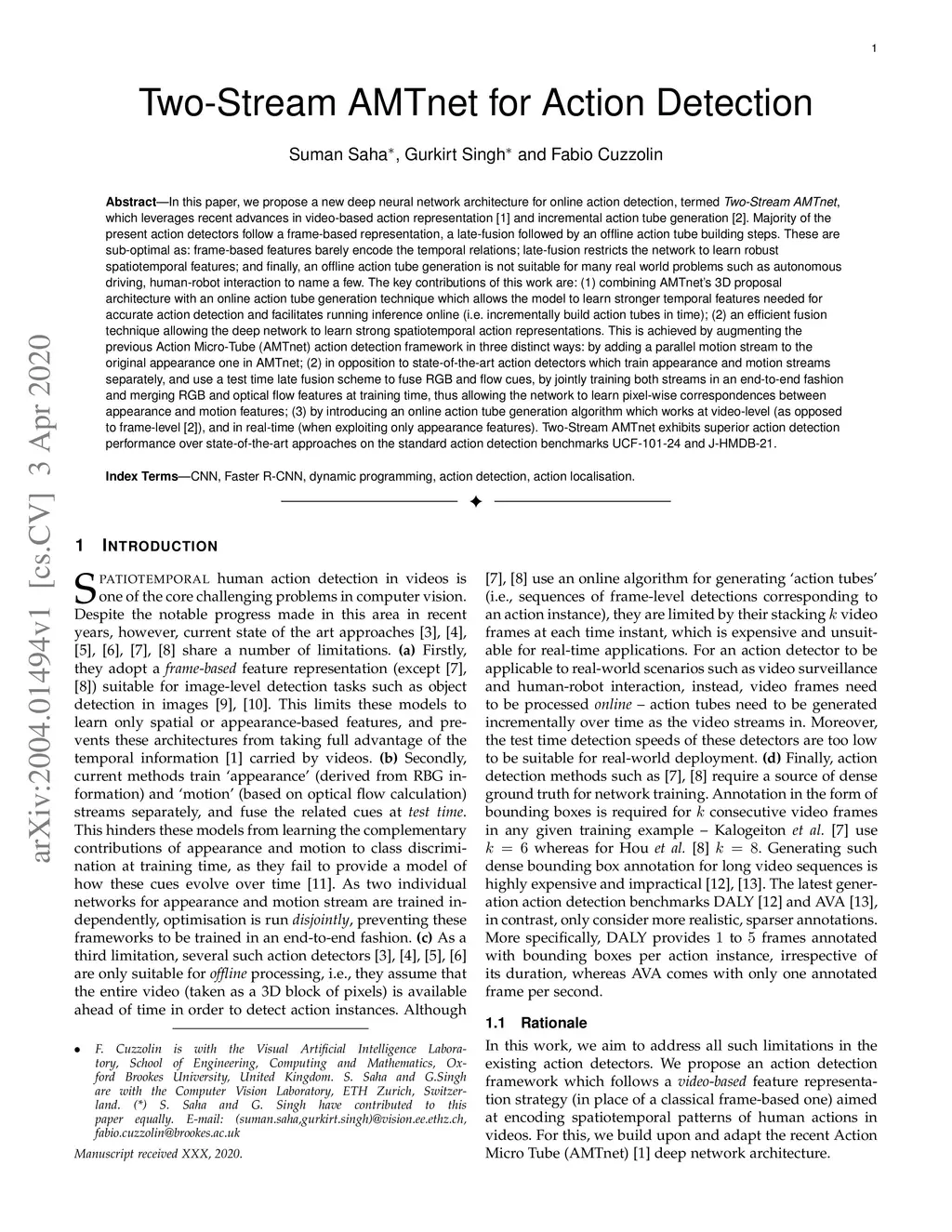 In this paper, we propose Two-Stream AMTnet, which leverages recent advances in video-based action representation[1] and incremental action tube generation[2]. Majority of the present action detectors follow a frame-based representation, a late-fusion followed by an offline action tube building steps. These are sub-optimal as: frame-based features barely encode the temporal relations; late-fusion restricts the network to learn robust spatiotemporal features; and finally, an offline action tube generation is not suitable for many real-world problems such as autonomous driving, human-robot interaction to name a few. The key contributions of this work are: (1) combining AMTnet's 3D proposal architecture with an online action tube generation technique which allows the model to learn stronger temporal features needed for accurate action detection and facilitates running inference online; (2) an efficient fusion technique allowing the deep network to learn strong spatiotemporal action representations. This is achieved by augmenting the previous Action Micro-Tube (AMTnet) action detection framework in three distinct ways: by adding a parallel motion stIn this paper, we propose a new deep neural network architecture for online action detection, termed ream to the original appearance one in AMTnet; (2) in opposition to state-of-the-art action detectors which train appearance and motion streams separately, and use a test time late fusion scheme to fuse RGB and flow cues, by jointly training both streams in an end-to-end fashion and merging RGB and optical flow features at training time; (3) by introducing an online action tube generation algorithm which works at video-level, and in real-time (when exploiting only appearance features). Two-Stream AMTnet exhibits superior action detection performance over state-of-the-art approaches on the standard action detection benchmarks.
