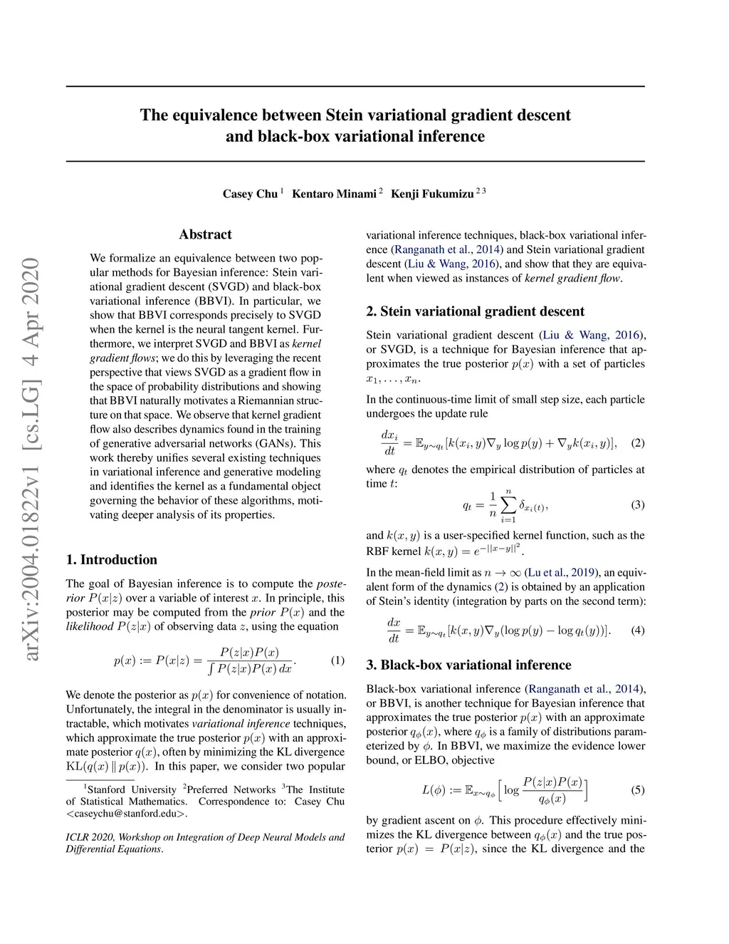 We formalize an equivalence between two popular methods for Bayesian inference: Stein variational gradient descent (SVGD) and black-box variational inference (BBVI). In particular, we show that BBVI corresponds precisely to SVGD when the kernel is the neural tangent kernel. Furthermore, we interpret SVGD and BBVI as kernel gradient flows; we do this by leveraging the recent perspective that views SVGD as a gradient flow in the space of probability distributions and showing that BBVI naturally motivates a Riemannian structure on that space. We observe that kernel gradient flow also describes dynamics found in the training of generative adversarial networks (GANs). This work thereby unifies several existing techniques in variational inference and generative modeling and identifies the kernel as a fundamental object governing the behavior of these algorithms, motivating deeper analysis of its properties.