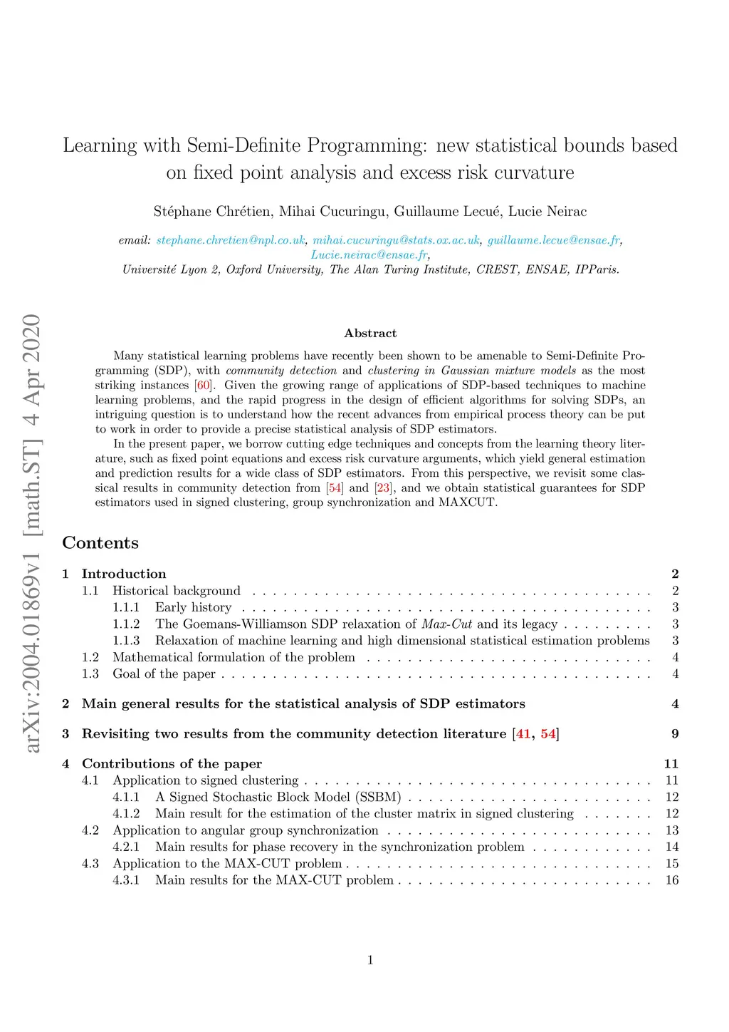 Many statistical learning problems have recently been shown to be amenable to Semi-Definite Programming (SDP), with community detection and clustering in Gaussian mixture models as the most striking instances [javanmard et al., 2016]. Given the growing range of applications of SDP-based techniques to machine learning problems, and the rapid progress in the design of efficient algorithms for solving SDPs, an intriguing question is to understand how the recent advances from empirical process theory can be put to work in order to provide a precise statistical analysis of SDP estimators. In the present paper, we borrow cutting edge techniques and concepts from the learning theory literature, such as fixed point equations and excess risk curvature arguments, which yield general estimation and prediction results for a wide class of SDP estimators. From this perspective, we revisit some classical results in community detection from [gu\édon et al.,2016] and [chen et al., 2016], and we obtain statistical guarantees for SDP estimators used in signed clustering, group synchronization and MAXCUT.