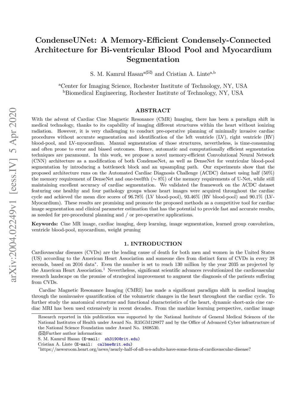 With the advent of Cardiac Cine Magnetic Resonance (CMR) Imaging, there has been a paradigm shift in medical technology, thanks to its capability of imaging different structures within the heart without ionizing radiation. However, it is very challenging to conduct pre-operative planning of minimally invasive cardiac procedures without accurate segmentation and identification of the left ventricle (LV), right ventricle (RV) blood-pool, and LV-myocardium. Manual segmentation of those structures, nevertheless, is time-consuming and often prone to error and biased outcomes. Hence, automatic and computationally efficient segmentation techniques are paramount. In this work, we propose a novel memory-efficient Convolutional Neural Network (CNN) architecture as a modification of both CondenseNet, as well as DenseNet for ventricular blood-pool segmentation by introducing a bottleneck block and an upsampling path. Our experiments show that the proposed architecture runs on the Automated Cardiac Diagnosis Challenge (ACDC) dataset using half (50%) the memory requirement of DenseNet and one-twelfth (~ 8%) of the memory requirements of U-Net, while still maintaining excellent accuracy of cardiac segmentation. We validated the framework on the ACDC dataset featuring one healthy and four pathology groups whose heart images were acquired throughout the cardiac cycle and achieved the mean dice scores of 96.78% (LV blood-pool), 93.46% (RV blood-pool) and 90.1% (LV-Myocardium). These results are promising and promote the proposed methods as a competitive tool for cardiac image segmentation and clinical parameter estimation that has the potential to provide fast and accurate results, as needed for pre-procedural planning and/or pre-operative applications.
