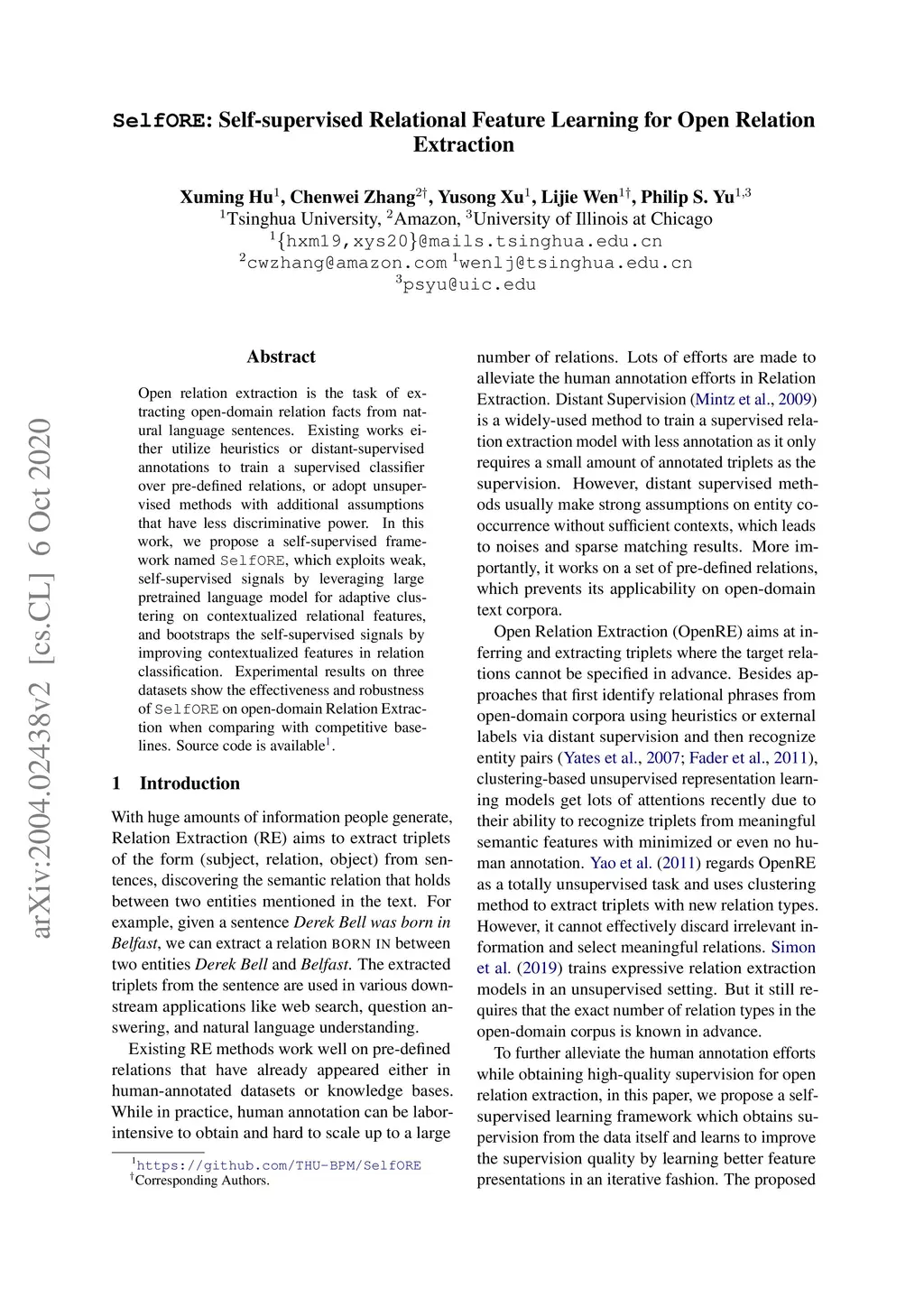 SelfORE: Self-supervised Relational Feature Learning for Open Relation